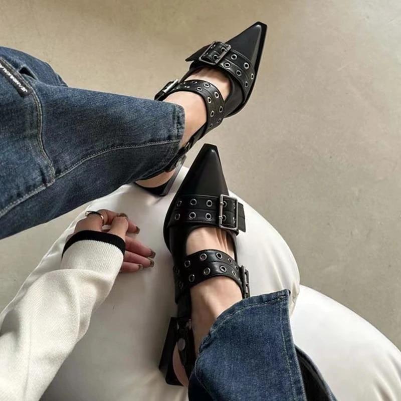 Новинка 2023 года, женские сандалии на массивном каблуке, летняя обувь, модная обувь на среднем каблуке с острым носком, вечерняя обувь, брендовая повседневная обувь, тапочки