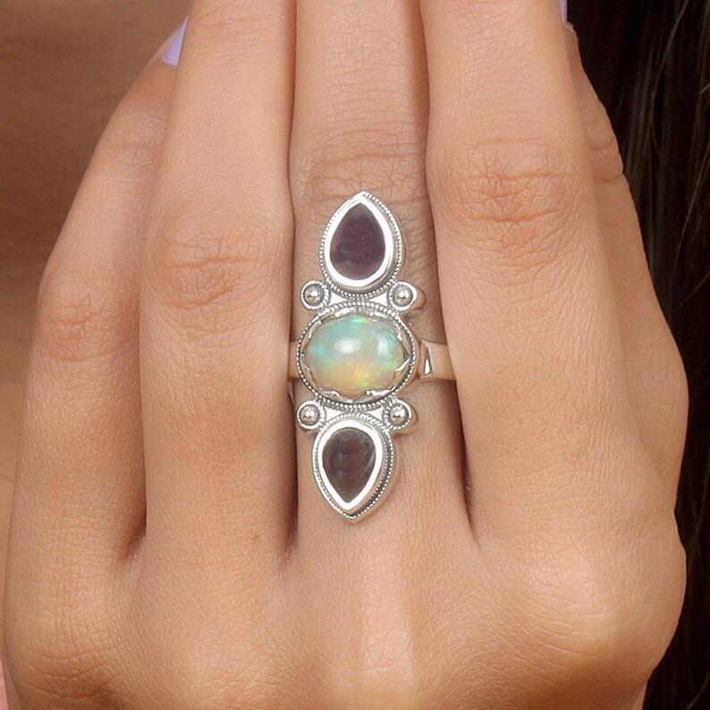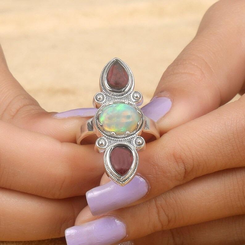 Кольцо из стерлингового серебра 925 пробы с опалом и гранатом, эффектные ювелирные изделия, женские кольца, кольцо в стиле бохо, серебряные ювелирные украшения, обручальное кольцо