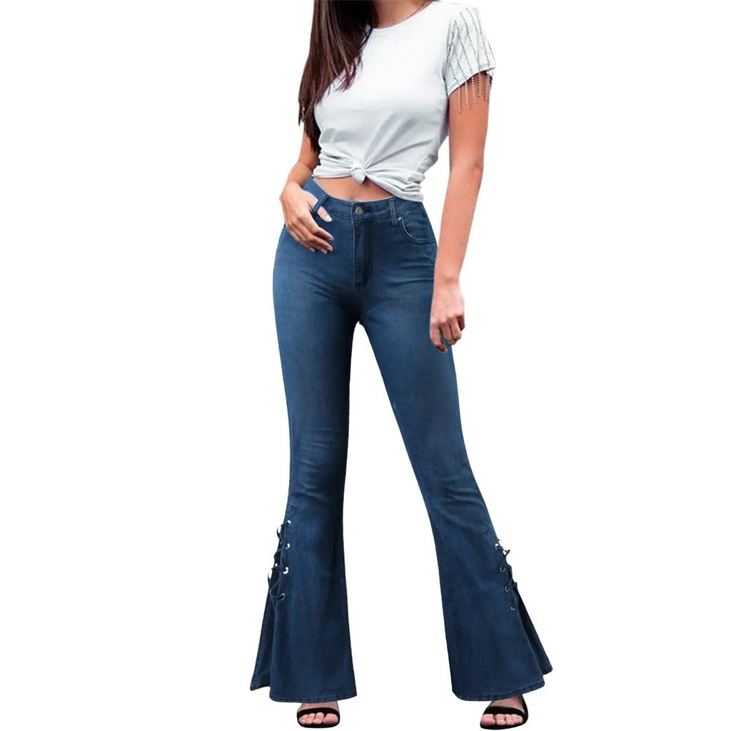 Женские расклешенные джинсы с высокой талией, джинсовые брюки, винтажная эластичная уличная одежда, брюки-клеш на шнуровке, эластичные джинсы