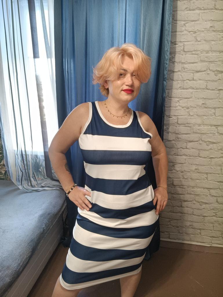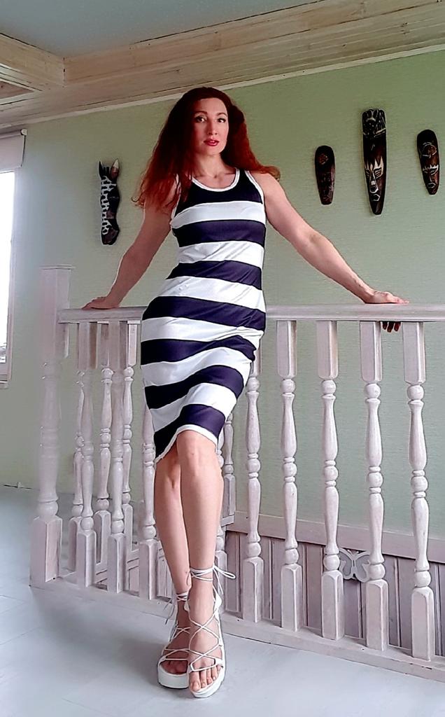 Полосатое платье. Симпатичное платье в морском стиле. Синтетика, но в жару в этом платье вполне комфортно. Я сейчас немного поправилась, поэтому взяла xl Сидит как надо, без лишнего прилегания. Я 165/102/76/103