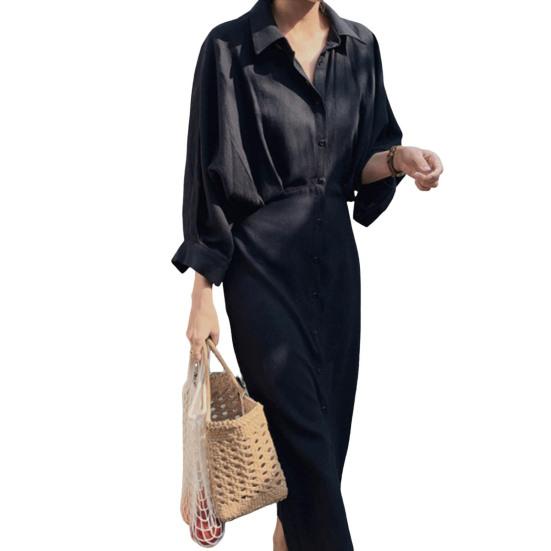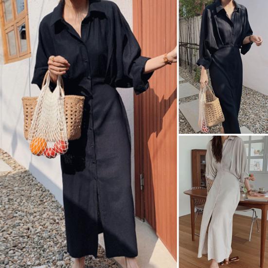 Характеристики: Это длинное платье с лацканами имеет свободный крой и сращено??детали со складками, которые прикрывают тело и делают вас стройнее. Это просто и модно.