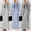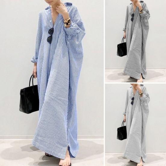 Это платье с лацканами, пуговицами, длинными рукавами, полосками и длинной юбкой идеально подходит для женщин больших размеров, которые ищут модный, но удобный наряд..