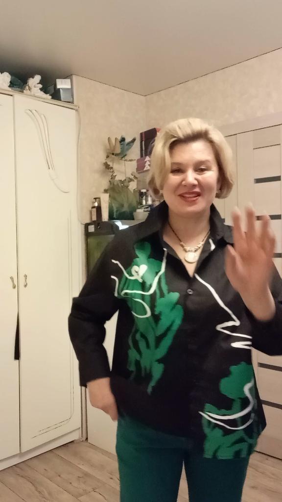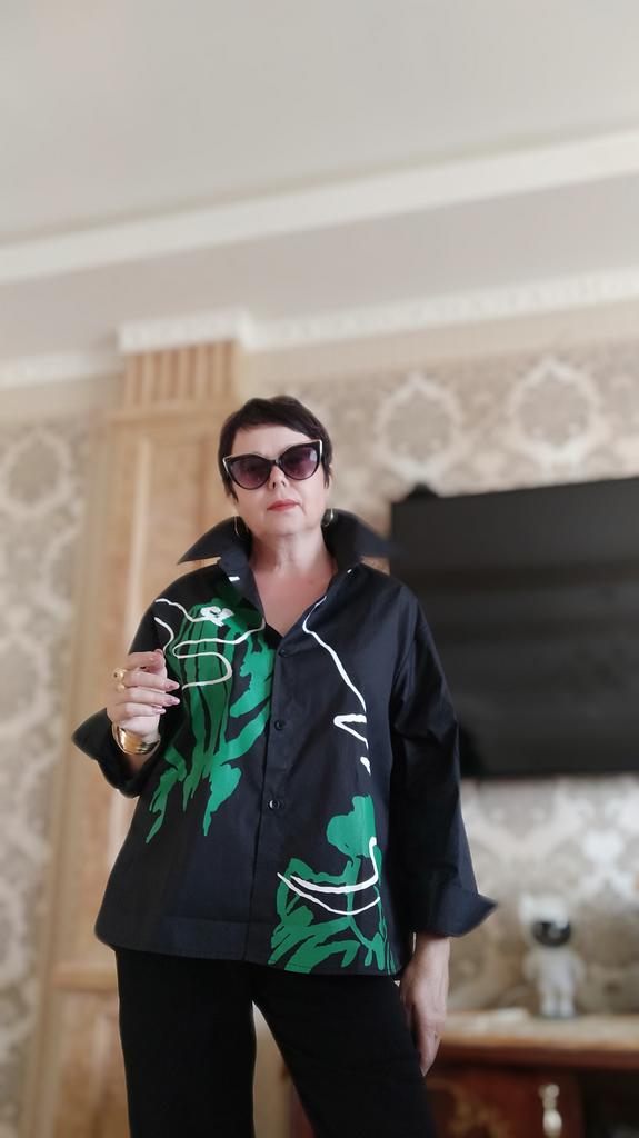 Рубашка эффектно смотрится,стильно.Рисунок нанесён на ткань,не известно,как будет выглядеть после стирки. Рукав три четверти,с манжетом,но я ношу на отворот,поэтому-- не критично. Материал топорщится,не знаю,как будет после стирки,так что это на сезон-- весна-- осень.Жаль,что коротковата модель.