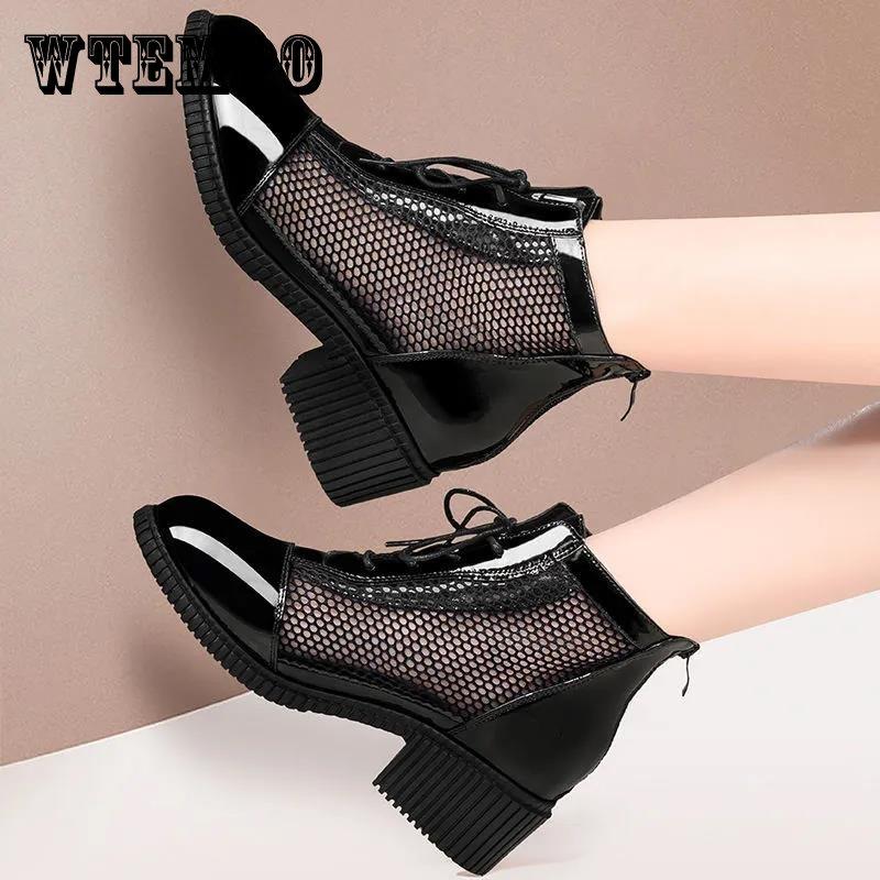 Черные сетчатые ботинки, женские ботинки на квадратном каблуке, кружевная молния сзади, искусственная кожа, мягкая кожа, новая мода, весна-осень