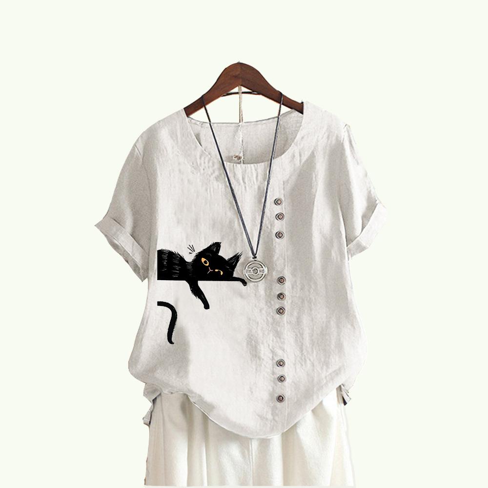 Женские модные блузки с короткими рукавами, летний повседневный пуловер, свободный топ с круглым воротником, хлопково-льняная футболка с принтом кота — купить товар онлайн с бесплатной доставкой по всему миру!