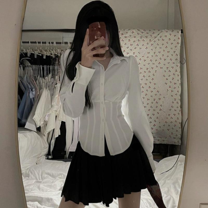 Рубашки женские, однотонные, в консервативном стиле, милые, простые, блузки, повседневные, базовые, тонкие, женские, хипстерские, Ulzzang JK, универсальные топы, популярные Ins — купить товар онлайн с бесплатной доставкой по всему миру!