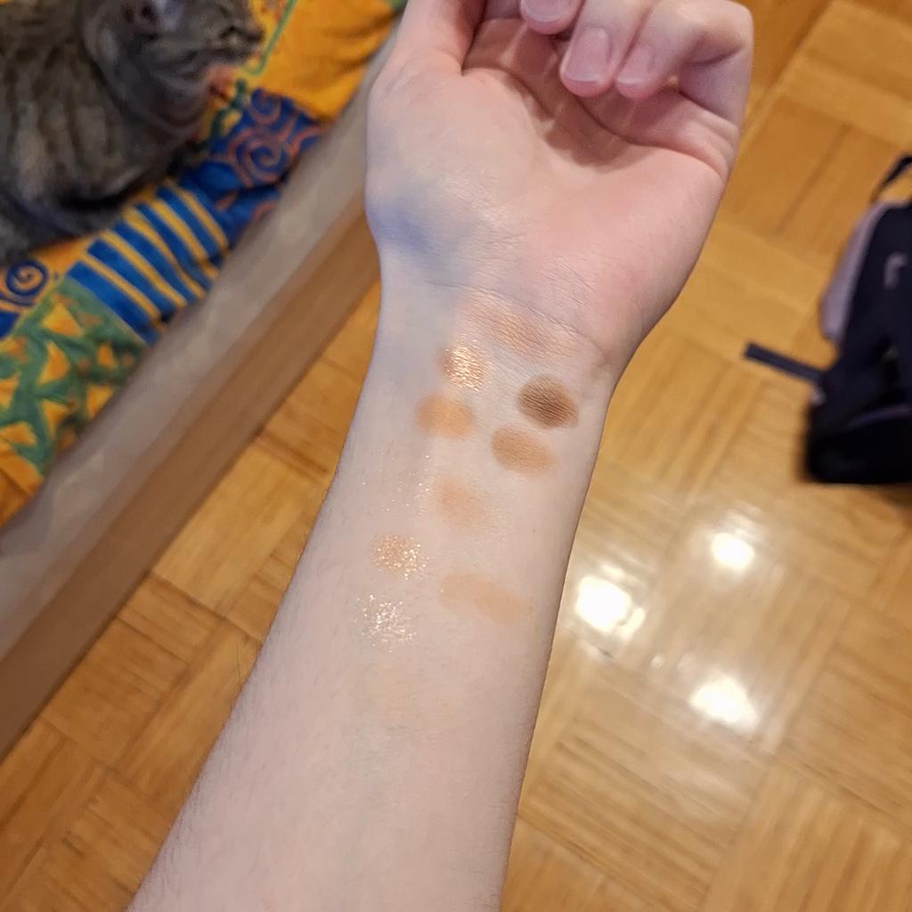 Палетка очень хорошая. Нюдовая, не слишком яркая. Блёстки сверкают невероятно красиво. Мне нравятся мвотчи, есть как яркие цвета, так и тушовочные. Румяна немного блестят. Пришло быстро, упаковано было хорошо. А так же спасибо за подарочки и письмо✨️❤️✨️