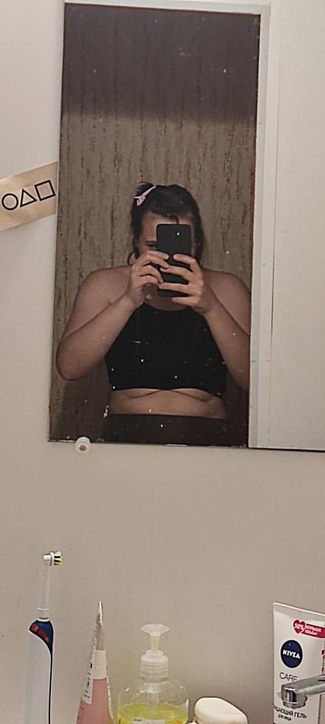 Я в этом топе выгляжу как свинья из ,, Ну, Погоди!,, Хахахаха Короче мал, это мягко сказано... У меня размер М ( гр. 98) в топе предусмотрена специальная поддержка для груди, которая по итогу её не держит из-за моих размеров 🤭