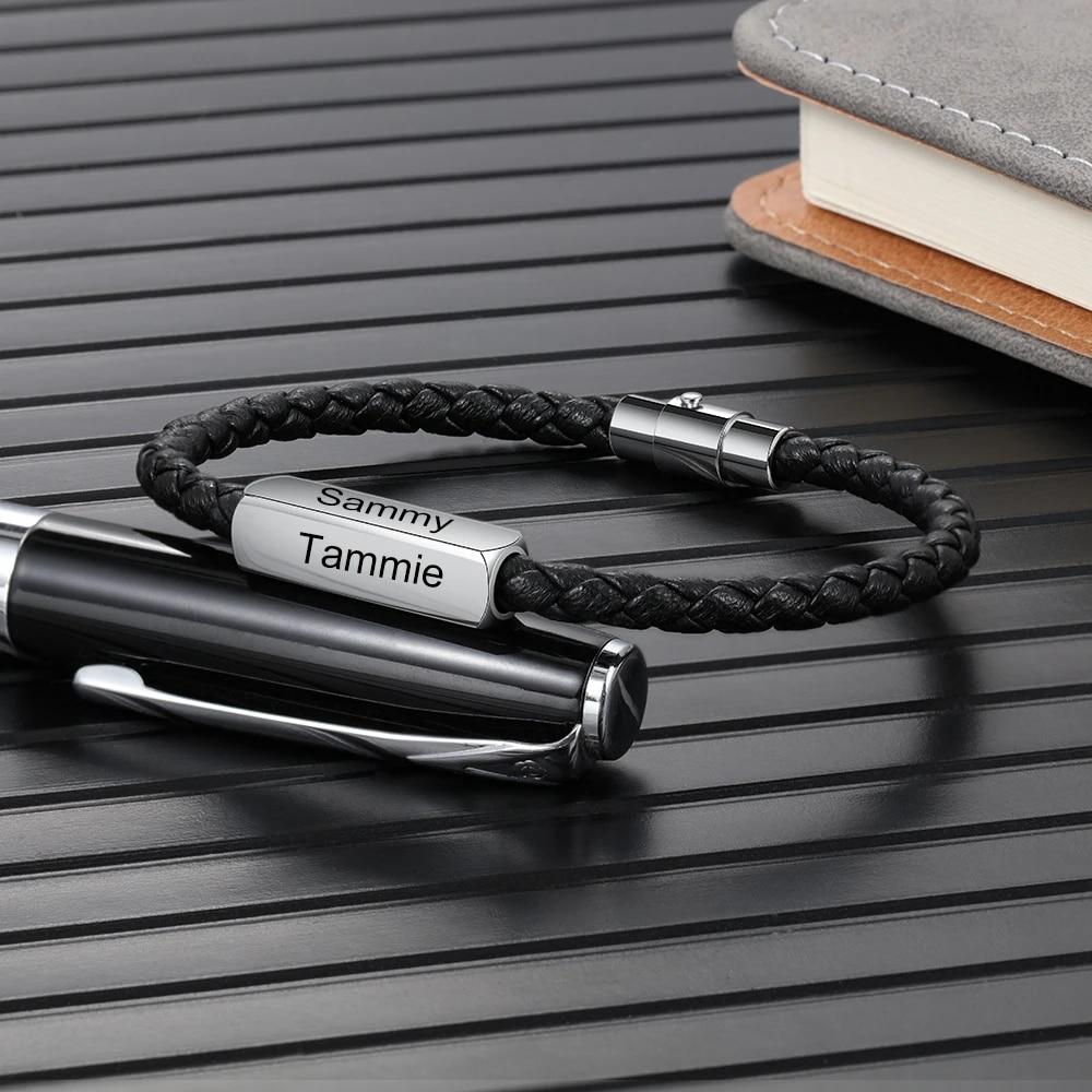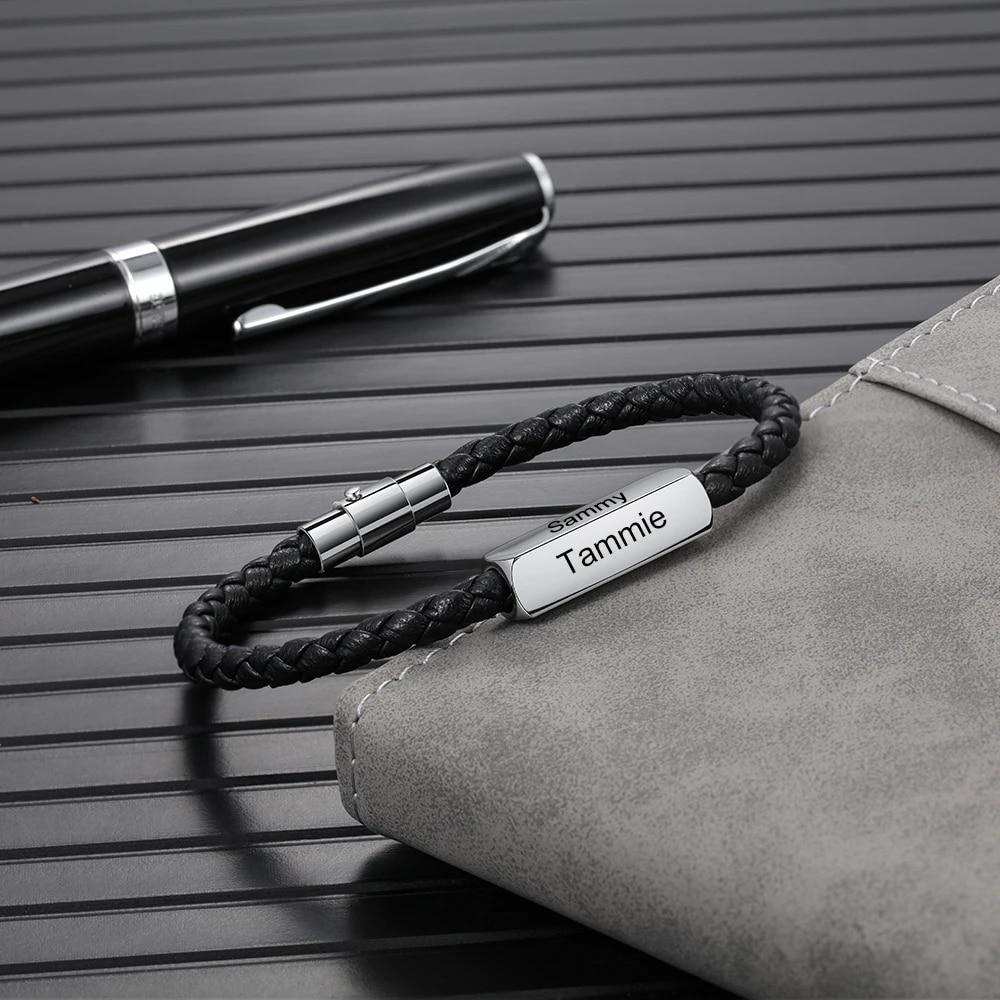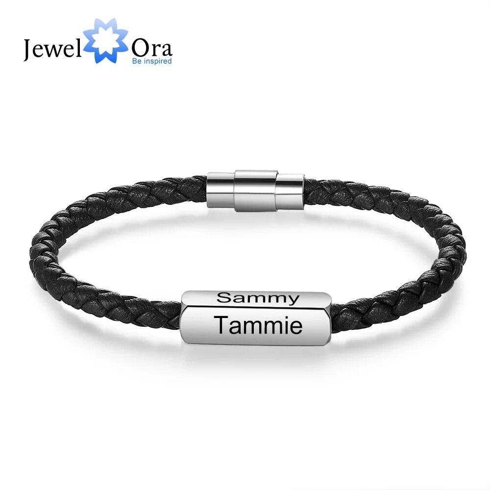JewelOra браслеты из нержавеющей стали с индивидуальной гравировкой 1-4 имен, черные плетеные кожаные браслеты для мужчин, подарки