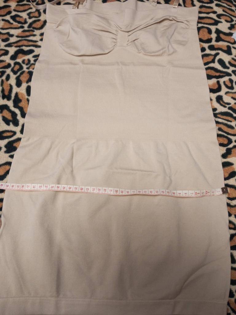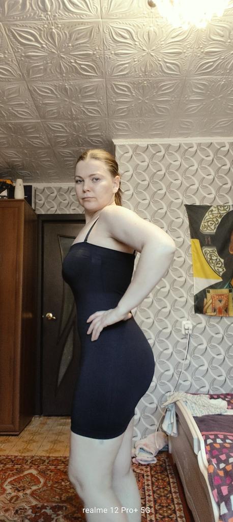 Взяла самый большой размер XXL, у меня 52 размер еле залезла. На талии утяжка и очень сложно натянуть на этом месте. Коррек. платье очень хорошо обтягивает, и видно все прелести вашей фигуры. Да ещё, где бретельки соединяются с платьем, с внутренней стороны упираются и делают больно телу, придется подливать ткань эластичную. Единственное утешаешь что оно будет одето внутри.