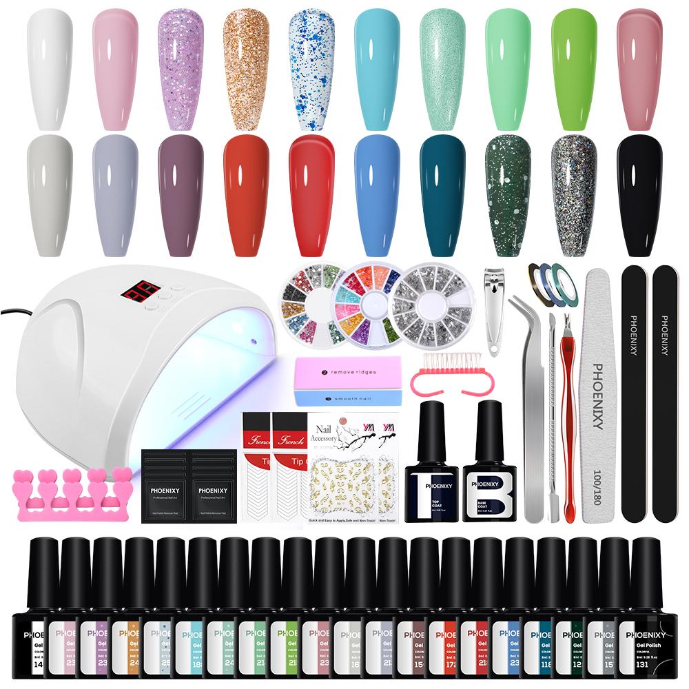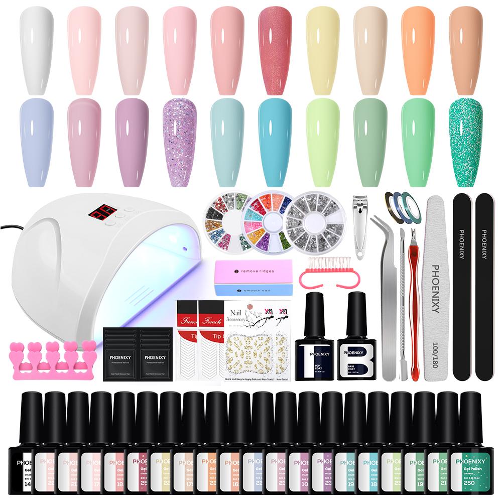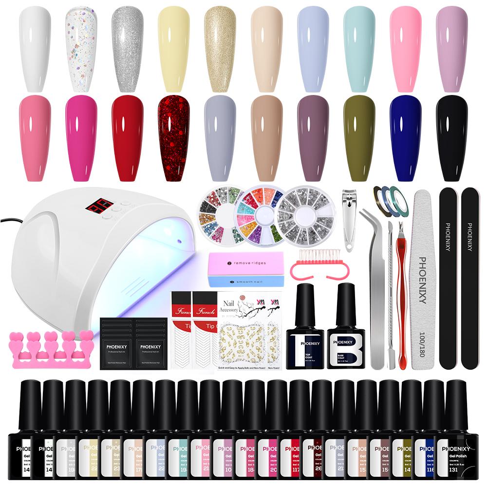 Набор гель-лака для ногтей PHOENIXY со светодиодной подсветкой 36 Вт, 20 цветов и набор базового верхнего покрытия, гель-лак, УФ-светодиодная лампа для ногтей, маникюрные инструменты, популярные дизайны дизайна ногтей