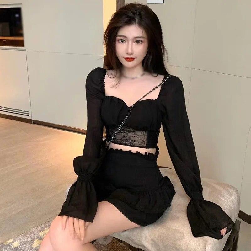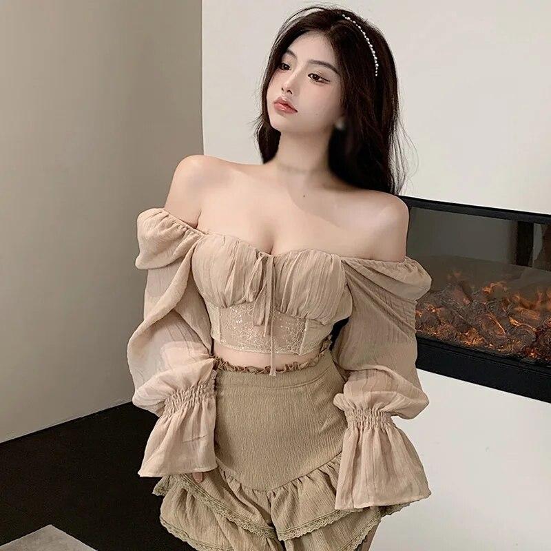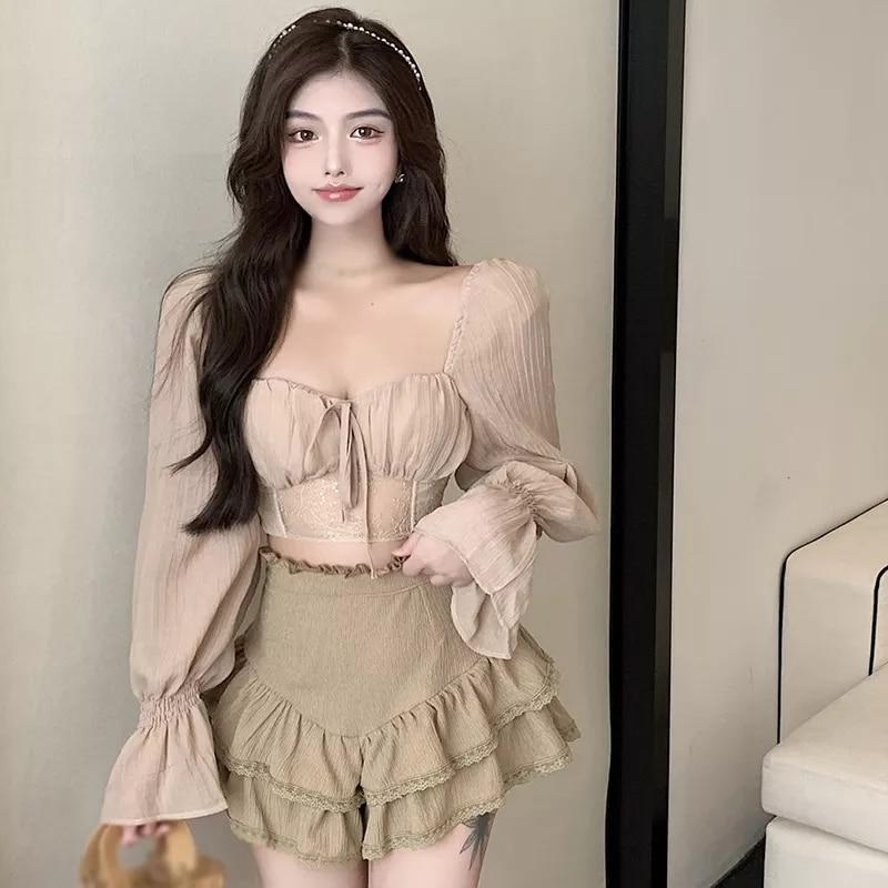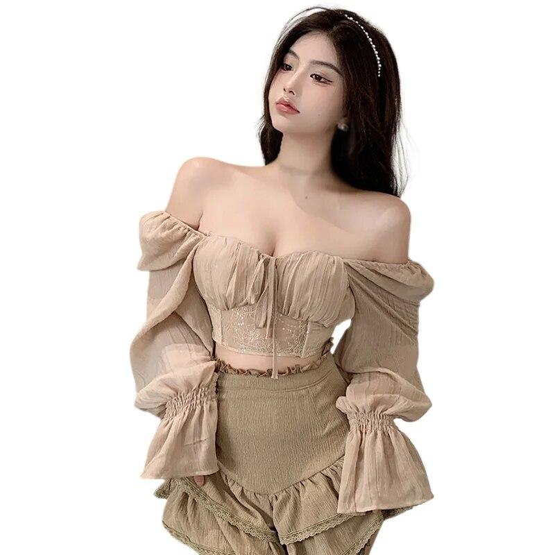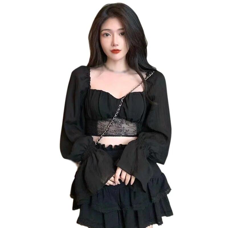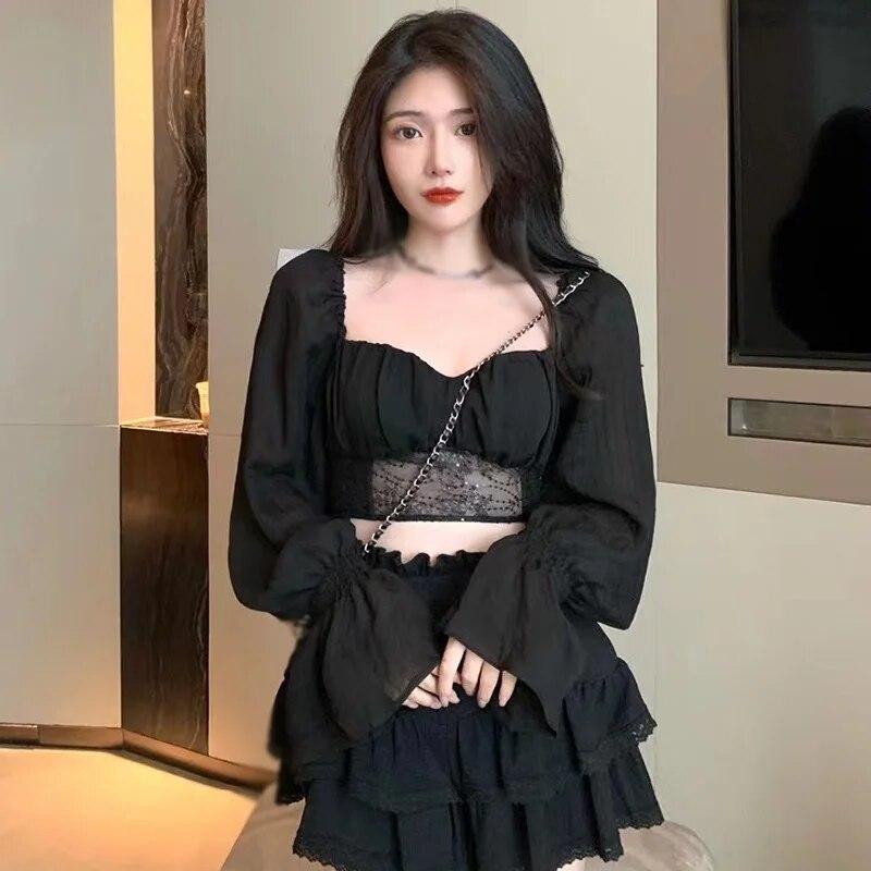 Женская шифоновая блузка с длинным рукавом, приталенный осенний наряд, повседневные рубашки, однотонный укороченный топ с оборками