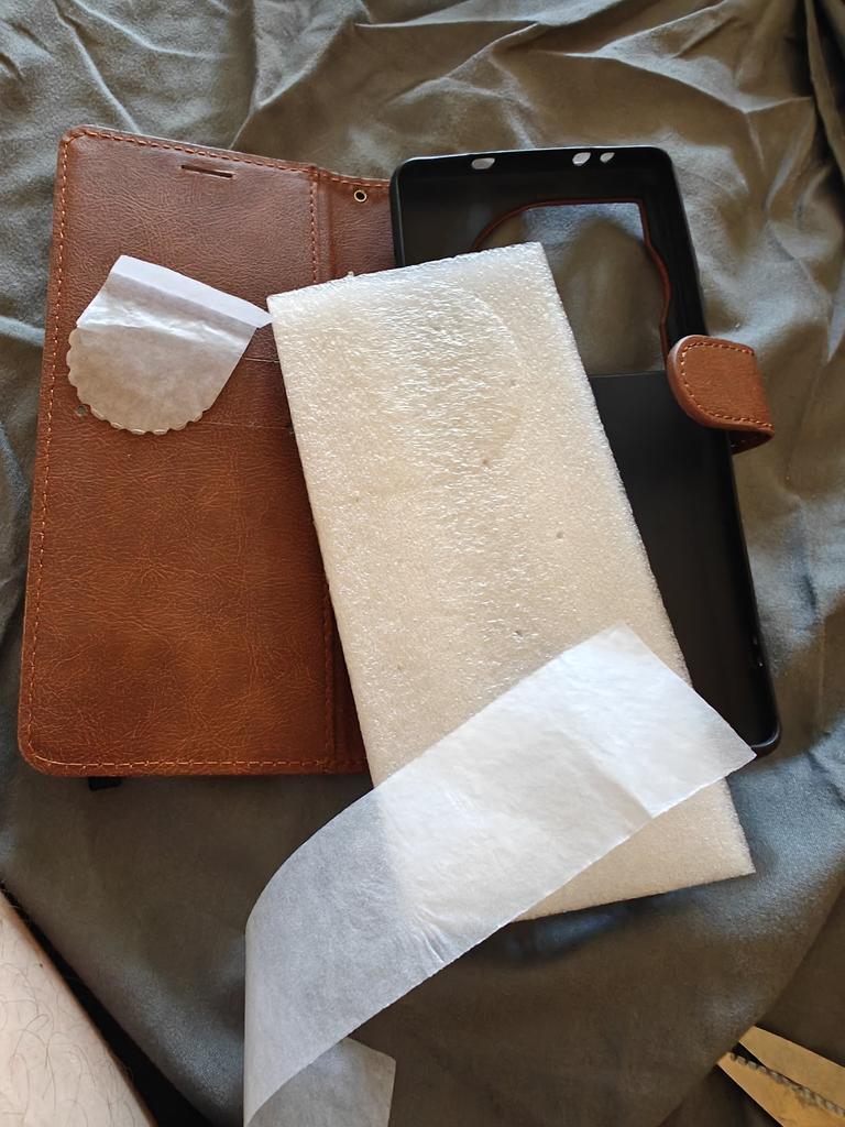 Посылка отслеживалась только до границы РФ. Пришла за пару недель. Красивый плотный чехол- книжка. Внутри 2 кармашка для карт и 1 большой кармашек, например для денег. Силиконовый бампер внутри, приклеен к чехлу наполовину. Внутри нашёлся простенький ремешочек. На телефон пока не примерял.