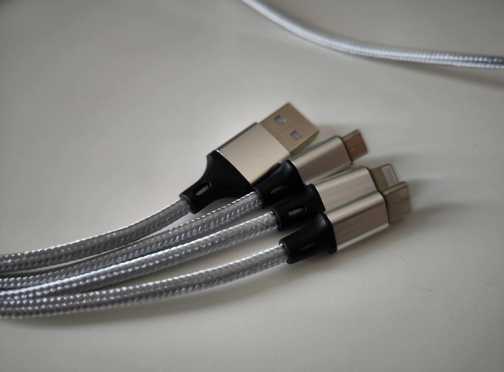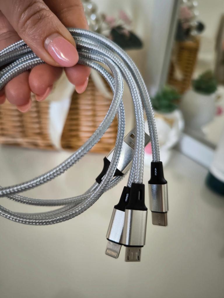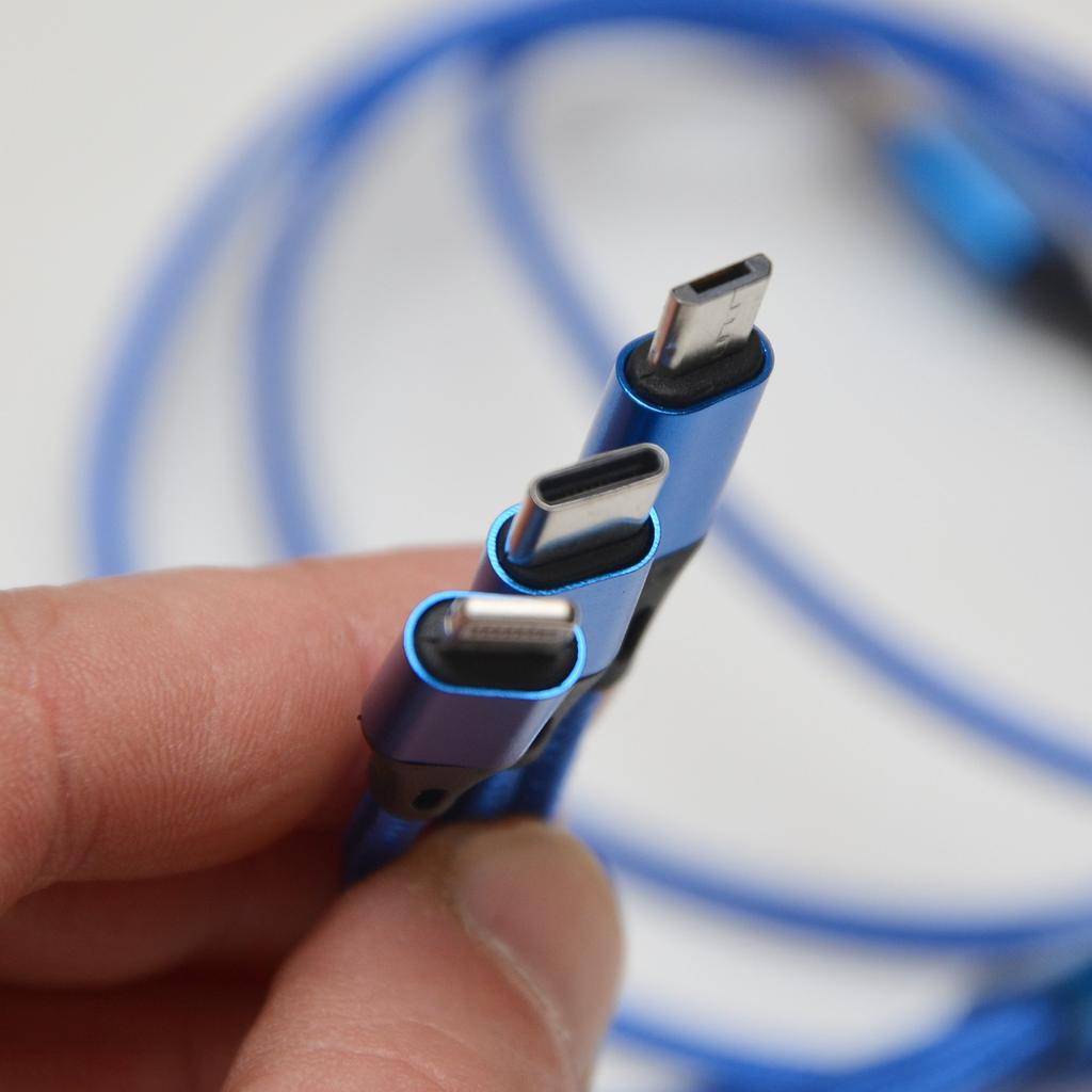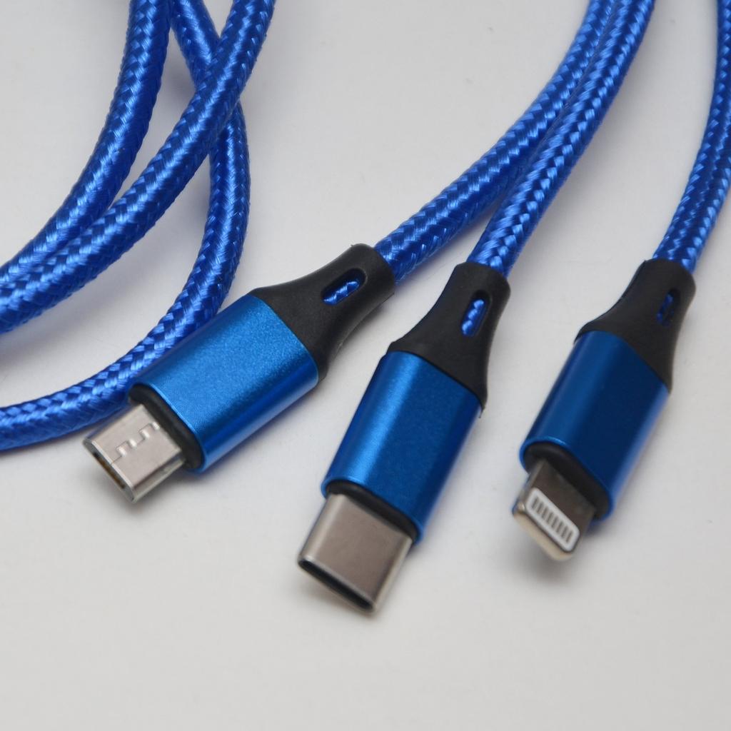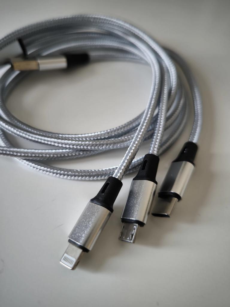 Универсальный кабель для зарядки 3 в 1 (Lighting, Type-C, Micro USB). 👍 Практичный кабель в дорогу. Может зарядить сразу 3 девайса с различными интерфейсами для зарядки. Выбрал синего цвета, при осмотре каких-либо внешних дефектов не обнаружил. Проверил сразу после распаковки. Заряжал смартфон (type-c), bluetooth наушники (lighting) и фонарик (micro usb). Кабель мягкий, качественная нейлоновая оплётка, на вид плотная. Все коннекторы без дефектов, сделаны хорошо. Кабель не поддерживает передачу данных. Доставка в срок. Кабель рабочий, покупкой доволен. 😊👍
