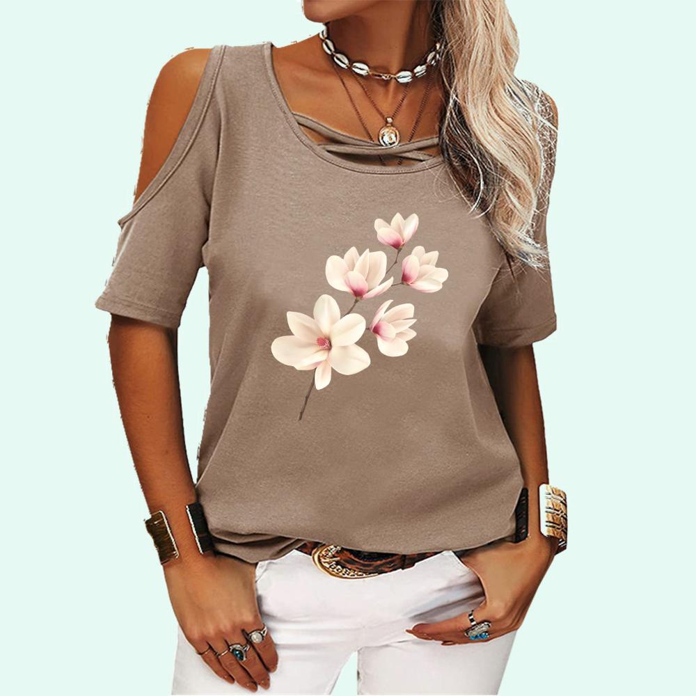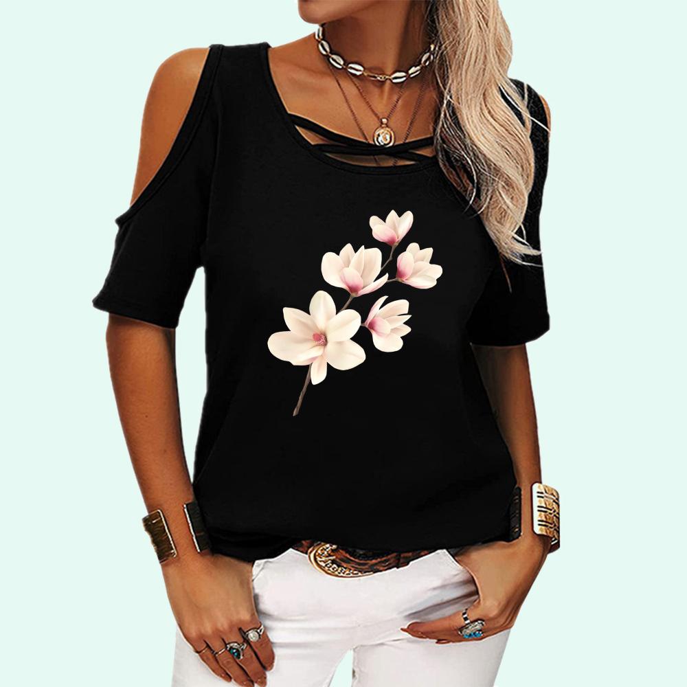 Женская повседневная футболка с коротким рукавом, летняя мода, топ с открытыми плечами, футболка с круглым вырезом и цветочным принтом, пуловер, женская футболка