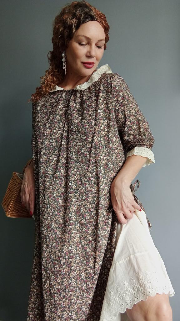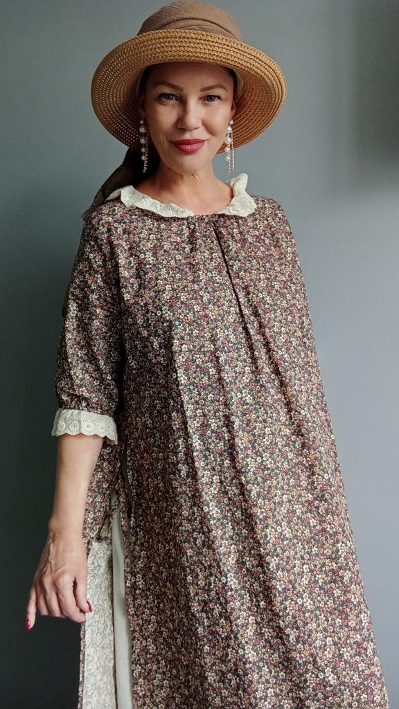 Платье в стиле "mori girl". 📌Собственно, мори- японская субкультура, дословно: "лесная девушка". Общее направление этого стиля - многослойность, натуральные ткани, натуральные цвета, и, часто, детскость. 📌Полагаю, это платье соответствует заявленному стилю. Имхо, оно также соответствует стилю наших барышень из 19 века. Вы не находите? 📌Единый размер, три цвета на выбор. У меня дубильная кора. Мои параметры: рост 167, 100-85-101. 📌Ткань действительно натуральная. У продавца заявлено: хлопок и лён. Возможно, так и есть. Ткань держит форму, после стирки, может быть, станет мягче. На воротнике, манжетах и внизу красивое шитьё. 📌Платье имеет подкладку (или нижнее платье), везде кроме рукавов. Ткань подкладки тоже натуральная. Силуэт расширенный к низу. В области талии верёвочки, и часть нижнего платья по бокам видна. В манжетах рукавов нетугая резинка. Пошив фабричный. 📐Замеры: Плечи 40 ОГ подмышками 112 ОТ 140 ОБ 150 Длина рукава от горловины 48 Длина рукава 38 Ширина рукава внизу 42-38 Длина 113-120.