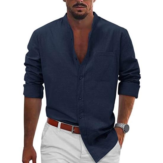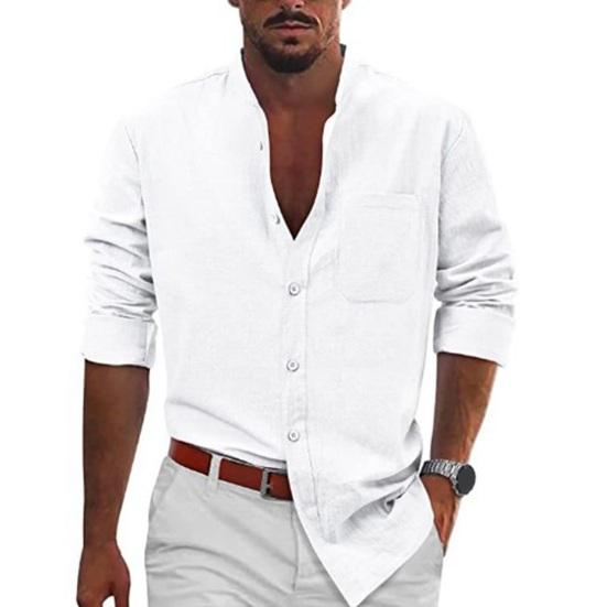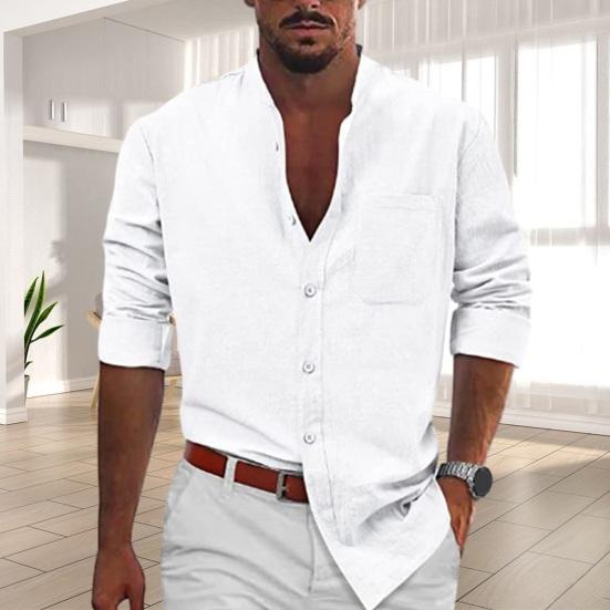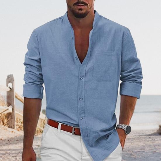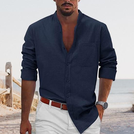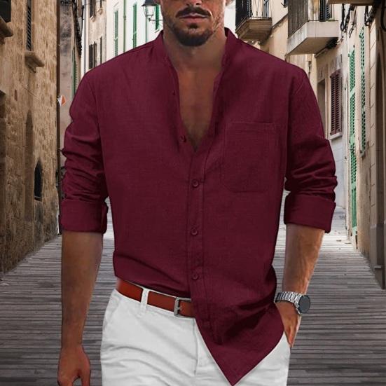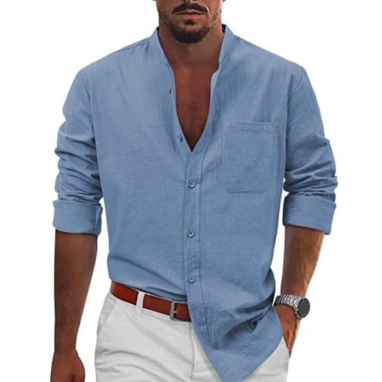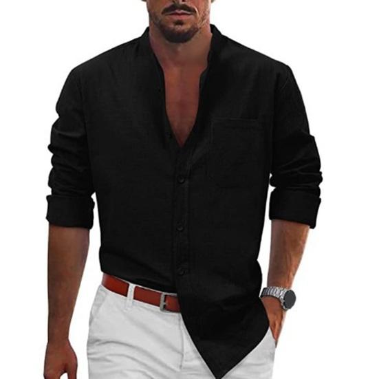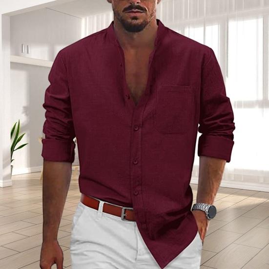Эта классическая рубашка однотонного цвета, с воротником-стойкой и длинными рукавами создает простой, но стильный образ..
