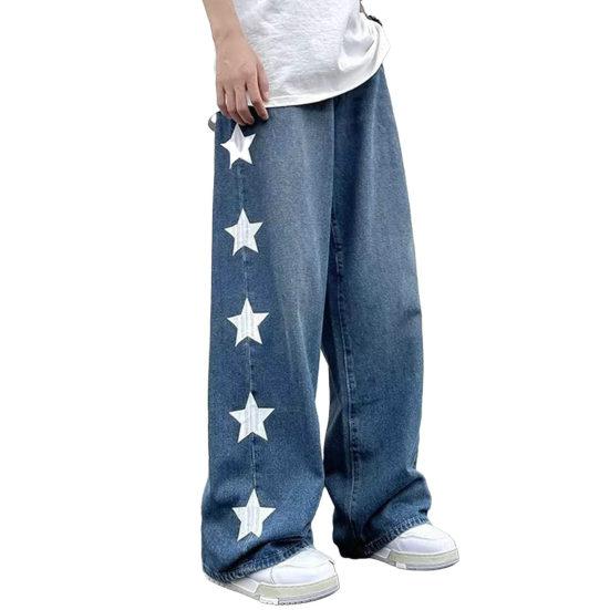 Мужские джинсы с широкими штанинами, прямые, свободные, со звездным принтом, полная длина, сплошной цвет, карманы, пуговицы, застежка-молния, мягкая уличная одежда в стиле ретро, мужские длинные брюки