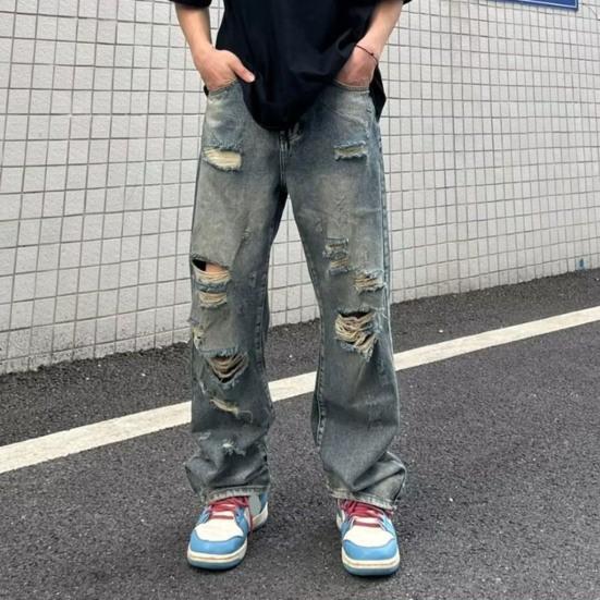 Модный дизайн: Ширинка на молнии и потертые рваные детали создают индивидуальный стиль.