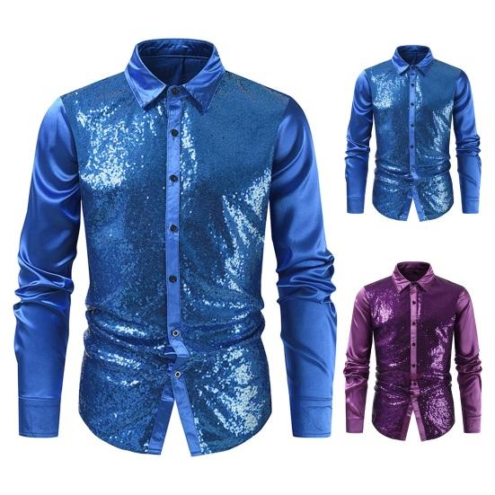 Мужская рубашка для выступлений с блестящими пайетками и отложным воротником, однобортная атласная рубашка с длинными рукавами и пуговицами для клубных вечеринок и сценических шоу