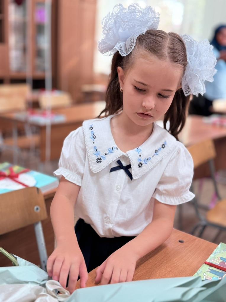 Материал очень качественный,мягкий,приятный к телу.Нарядная,для школы и с жилеткой и с пиджаком и с сарафанчиком,брюками.