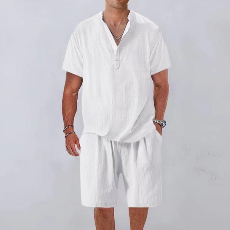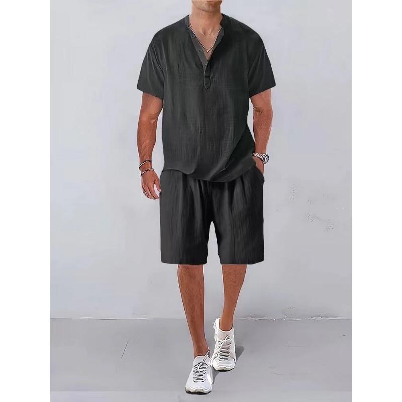 Летние мужские костюмы, воротник-стойка, рубашка с коротким рукавом, комплект из 2 предметов, повседневные шорты с карманами, спортивные костюмы, мужские спортивные комплекты из двух предметов