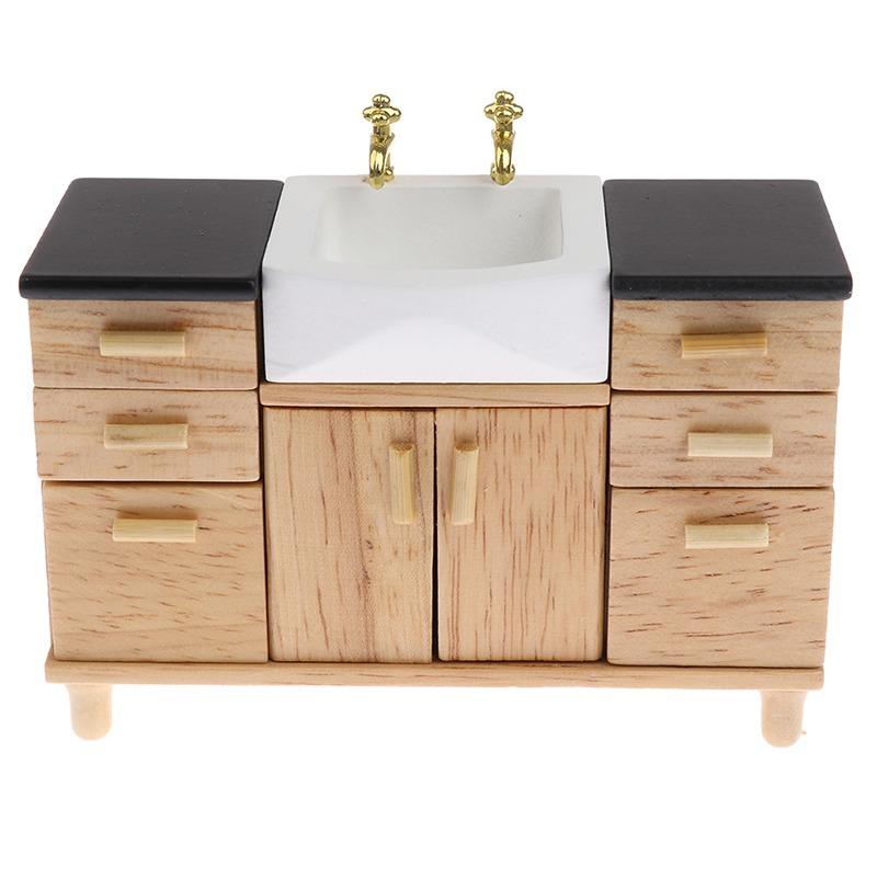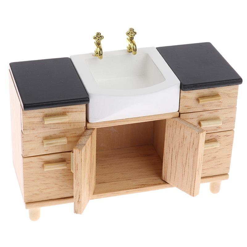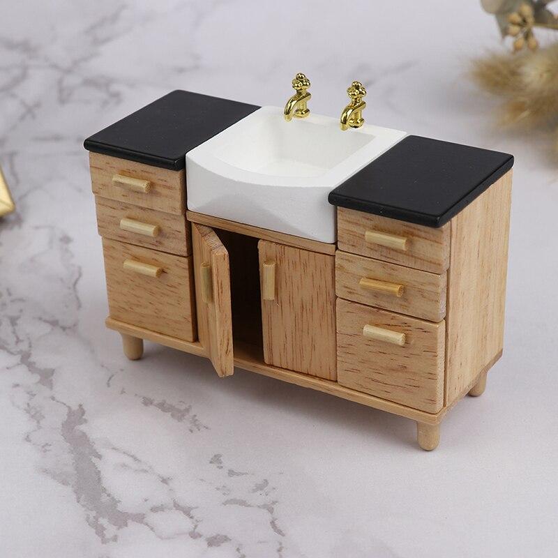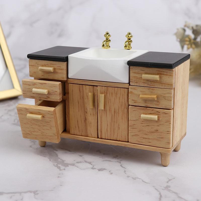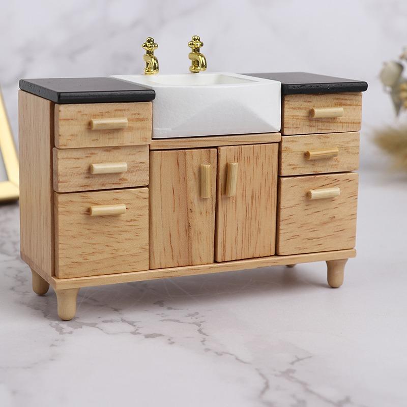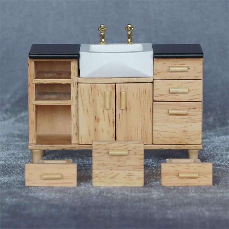 1:12 деревянных шкафов для умывальника с керамической раковиной, миниатюрная мебель, игрушки для кукольного домика, украшение для ванной комнаты и кухни