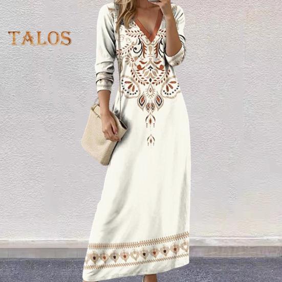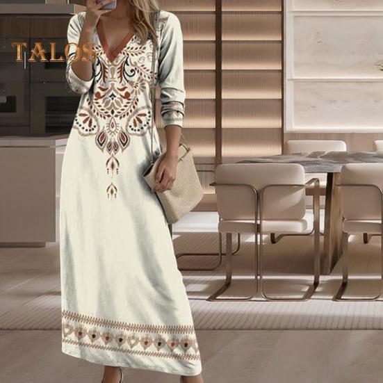 Женское весеннее платье в этническом стиле с принтом, V-образным вырезом и длинными рукавами, богемный свободный пуловер трапециевидной формы, мягкое дышащее платье до щиколотки, повседневное платье макси