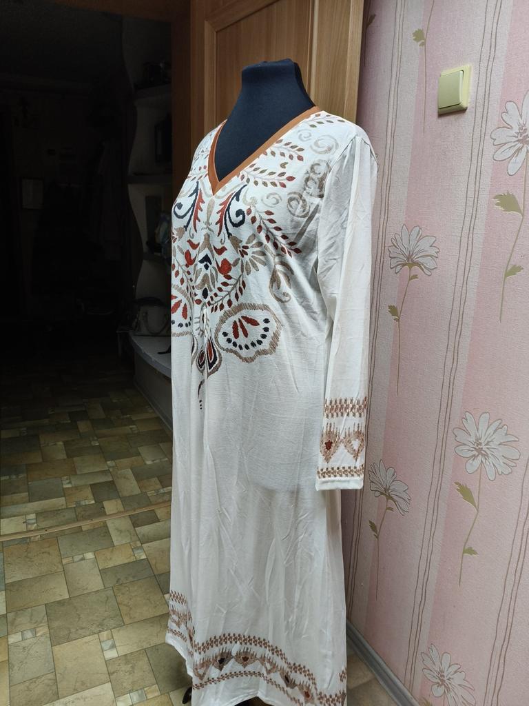 Трикотажное платье. К сожалению я не в восторге. Была бы хлопковая или льняная ткань, было бы намного лучше. Для этого платья нужна идеальная фигура. Будите покупать берите на размер больше.
