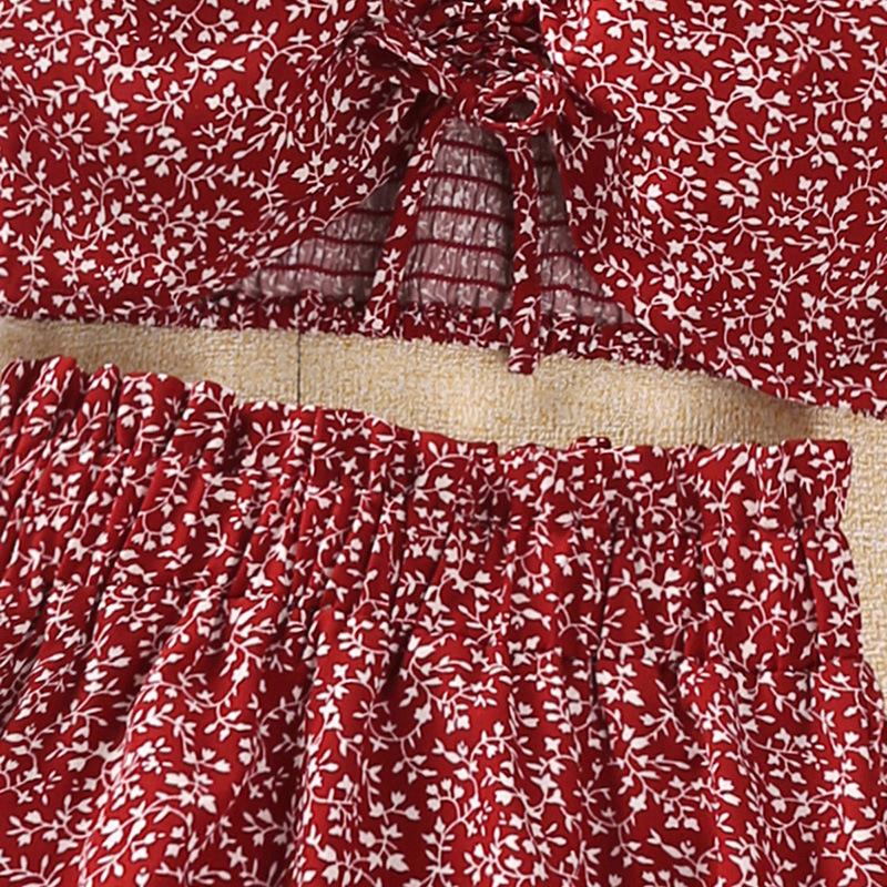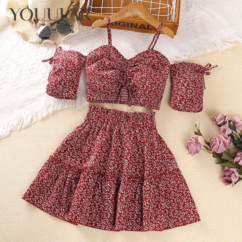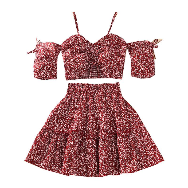 Лето 2024, топ с короткими рукавами для девочек на подтяжках + юбка с цветочным принтом, комплект из 2 предметов, детская одежда