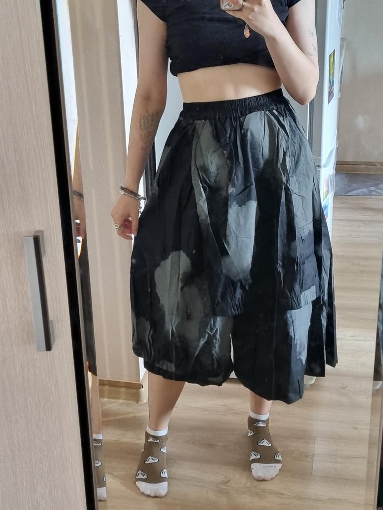 Из всех заказов на Джуме - это сама лучшая моя покупка. Потрясающая модная юбка на дождливый летний день, теплую весны и осень. Сделана она из плотной синтетики типа плащевки. Очень хорошо смотрятся эти свободные полы с резинками внизу. Носить нужно с облегающим однотонный верхом (типа водолазки или заправленной вовнутрь блузки), лучше ярким. Правда, юбка помялась при доставке, и я ее сама из-за фасона отутюжить не смогу: отнесу в мастерскую. Но все равно, спасибо производителю. Всем, кто носит радикальную одежду, рекомендую.