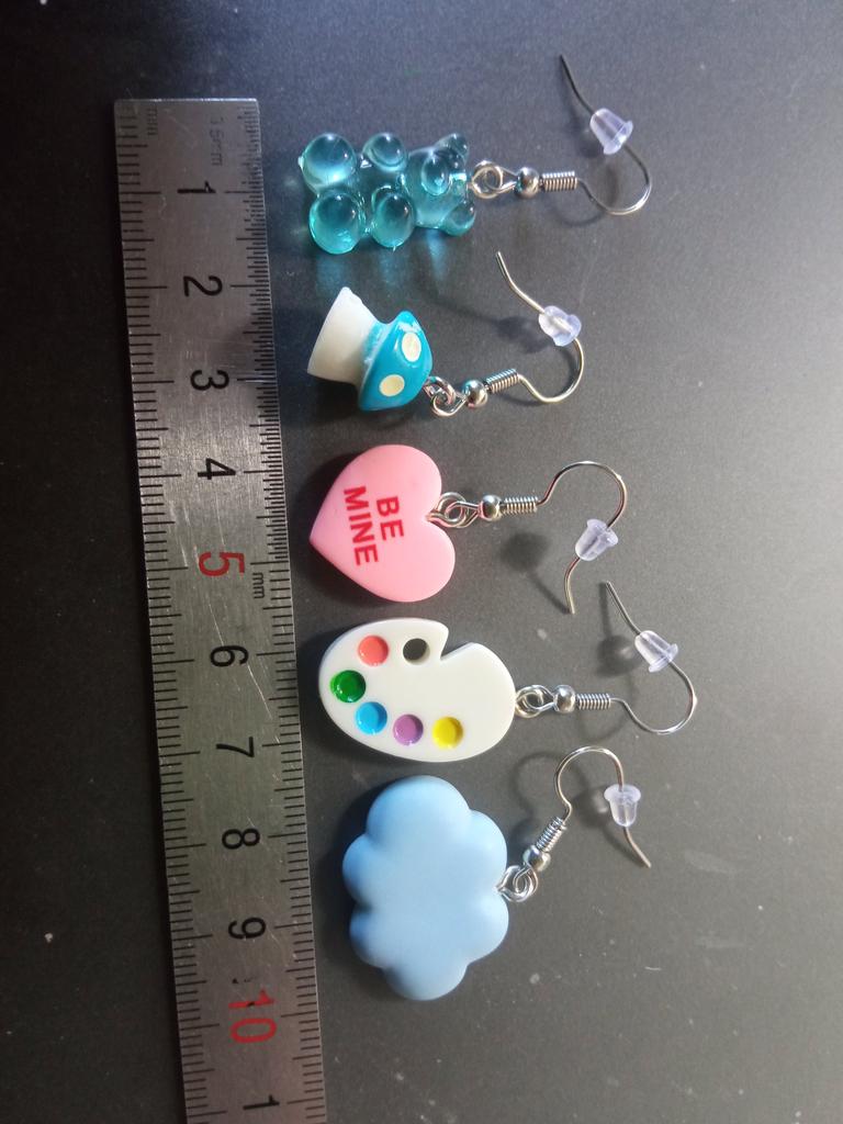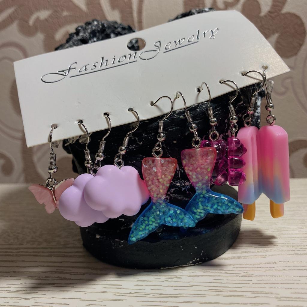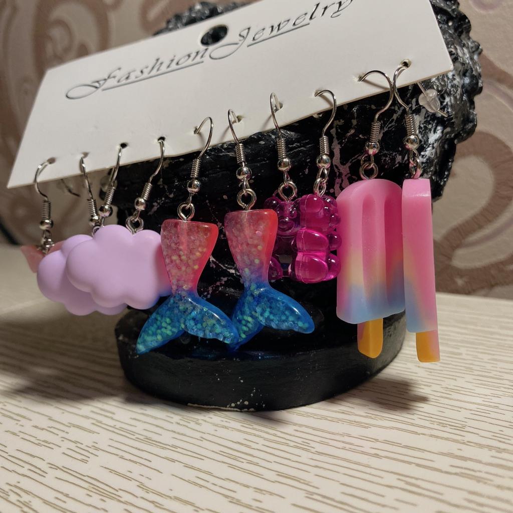 Очень милые и яркие сережки на каждый день 😍 Идеальный набор из пяти штук, чтобы добавить настроение к любому образу) У меня 14 вариант. - Сделаны из пластмассы; - Хорошо прокрашены, качество отличное: никаких трещин или царапин; - Есть силиконовые стопперы, держатся на сережках хорошо. Думаю, что будут держаться и без стопперов; - Цвета яркие и приятные, детальность хорошая; - Аллергии нет, но у меня с этим в целом проблем нет.
