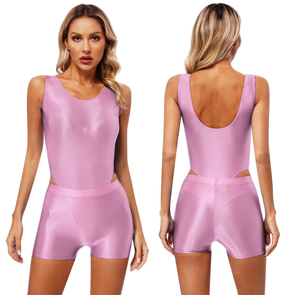Женский глянцевый купальник из двух предметов, боди без рукавов, шорты со средней талией, шорты для йоги, фитнеса, купальный костюм