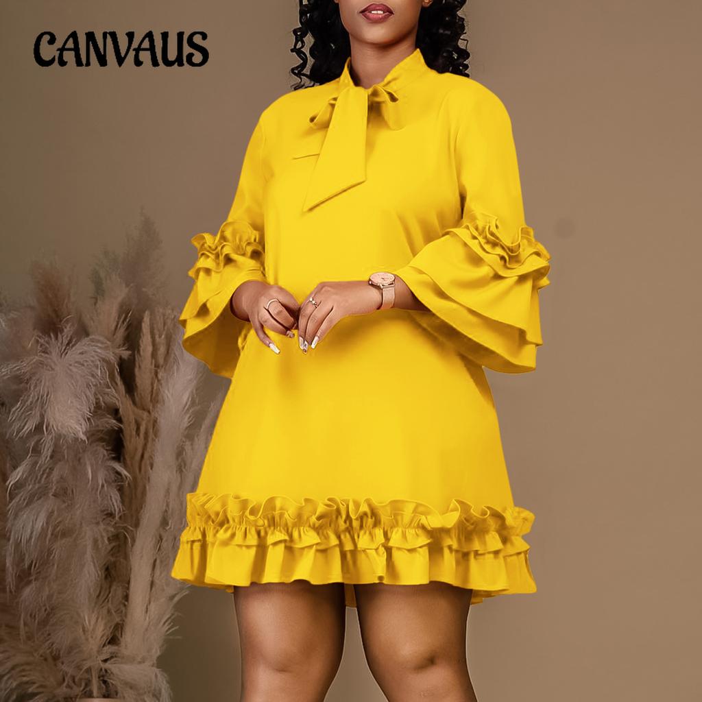 Весенне-летнее женское платье больших размеров, свободные повседневные однотонные платья с рюшами и рукавами и галстуком