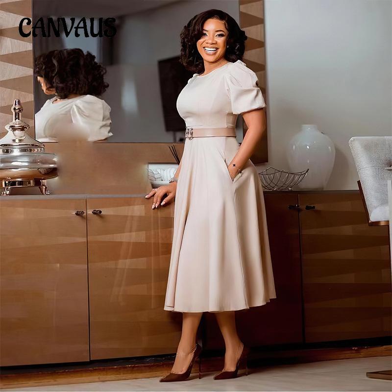 Летнее женское платье больших размеров с круглым вырезом, темпераментное элегантное платье трапециевидной формы с большой талией и рукавами-пузырьками