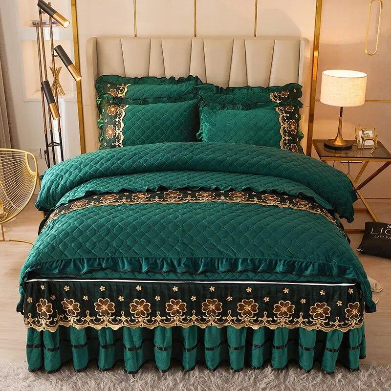 Стеганый бархатный комплект постельного белья Queen King Size, двуспальная кровать, пододеяльник, кружевная юбка на молнии, европейские однотонные 2 наволочки