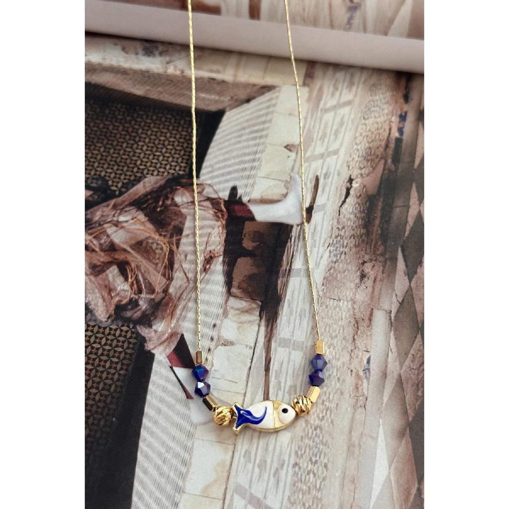 Темно-синее ожерелье-цепочка с изображением рыбы и хрустального камня