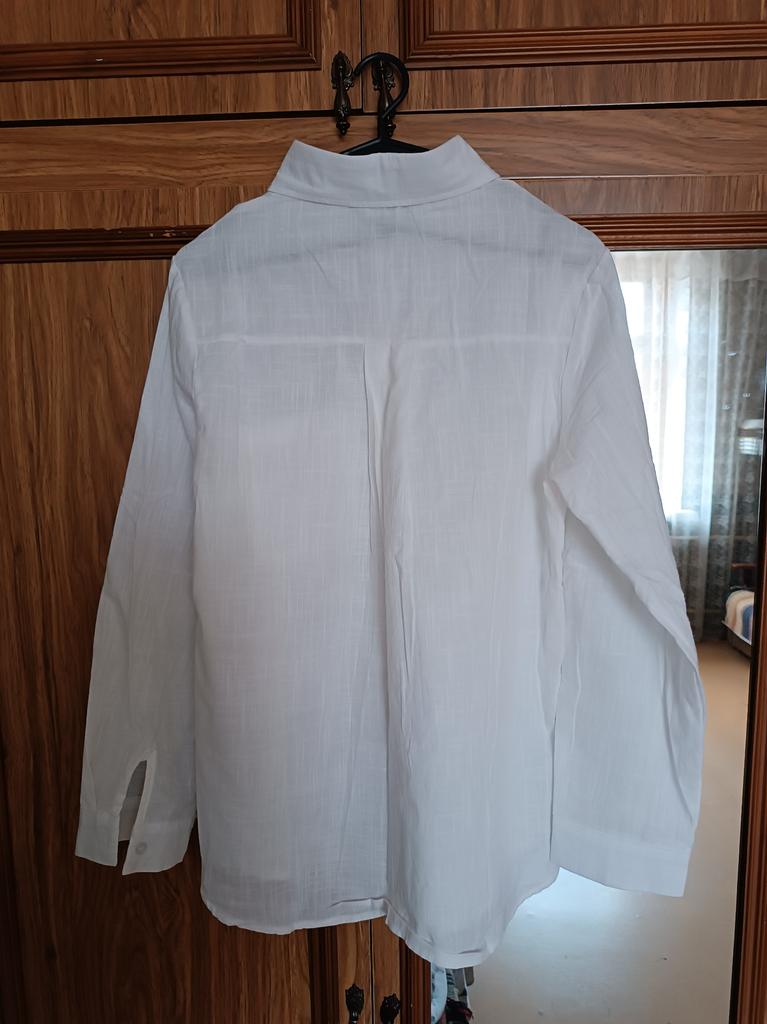 Легкая летняя рубашка молочного цвета. На размер 44 как раз подошла S. Но боковые швы пришлось ушить в области бедер. Довольно качественный пошив и обметка. Красиво стоит воротник. Спасибо.