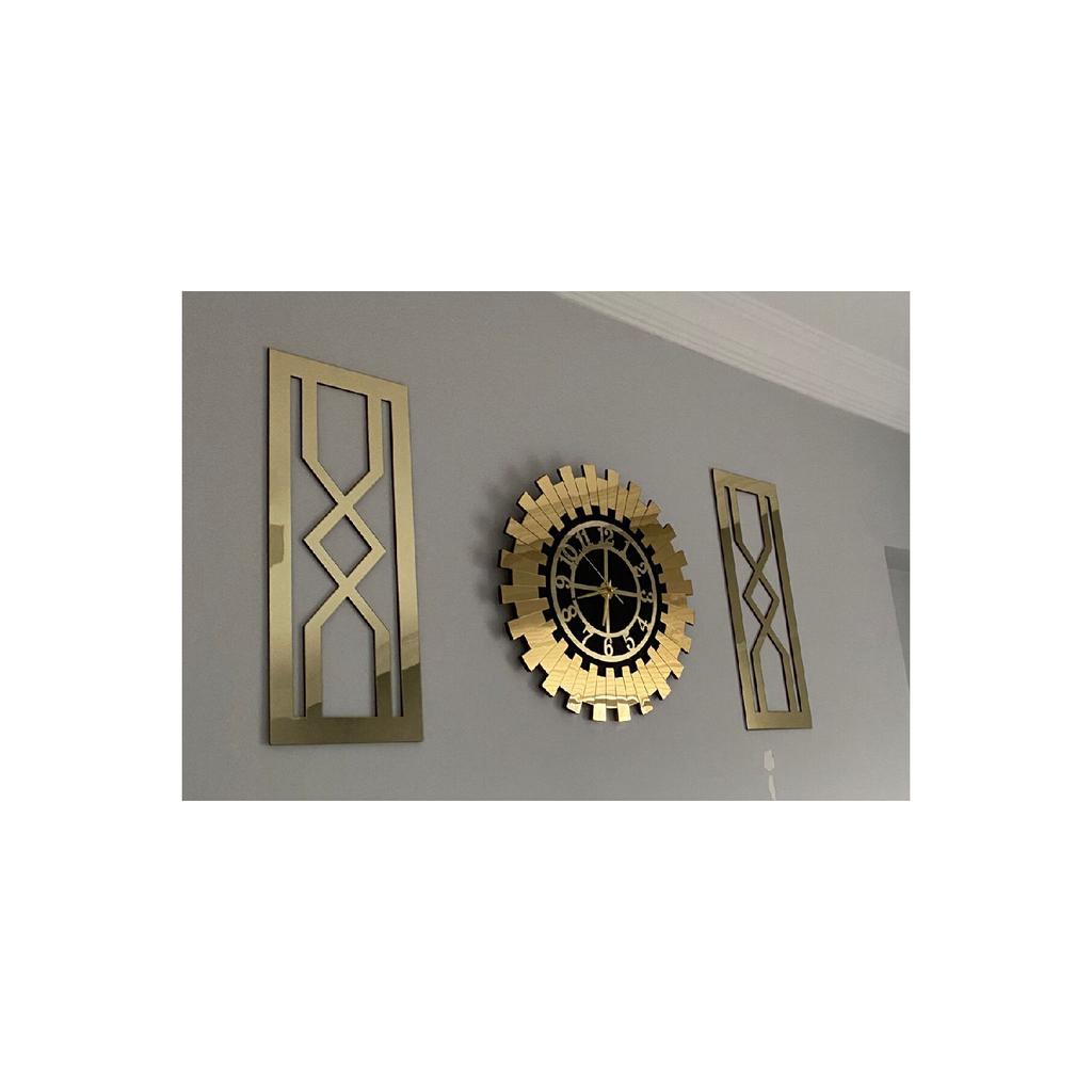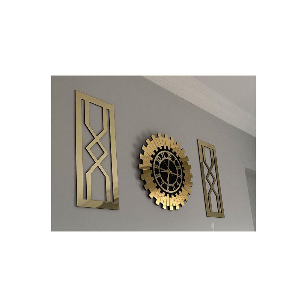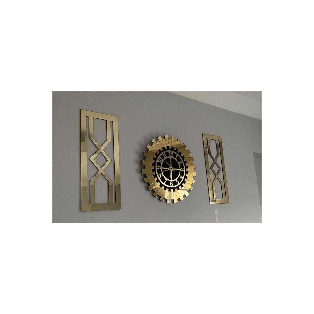 Декоративные, современные, турецкие цифры для дома и офиса, золото (Золотисто-желтый) Набор декоративных настенных часов из 3 предметов. Современные солнечные часы диаметром 50 см и 2 картины размером 25x60 см с рисунком песочных часов.. Это привлекательные настенные часы с благородством золотисто-желтого цвета. (золото) цветной, работающий с бесшумным механизмом, не издающим звука тик-ток, который вы можете использовать для современного и яркого украшения как дома, так и офиса.. Благодаря бесшумной работе (Механизм Акара), солнечные часы, которые вы можете использовать в любом уголке вашего дома, включая спальню и детскую комнату, определят ваше время в современном и ярком стиле для вашего офиса.. Вы можете купить эти стильные и яркие часы как для себя, так и в качестве подарка на день рождения, юбилей, новый дом или новый офис для своего супруга, друга или родственника.. Работает от 1 батареи. (батарея не включена) рельефный