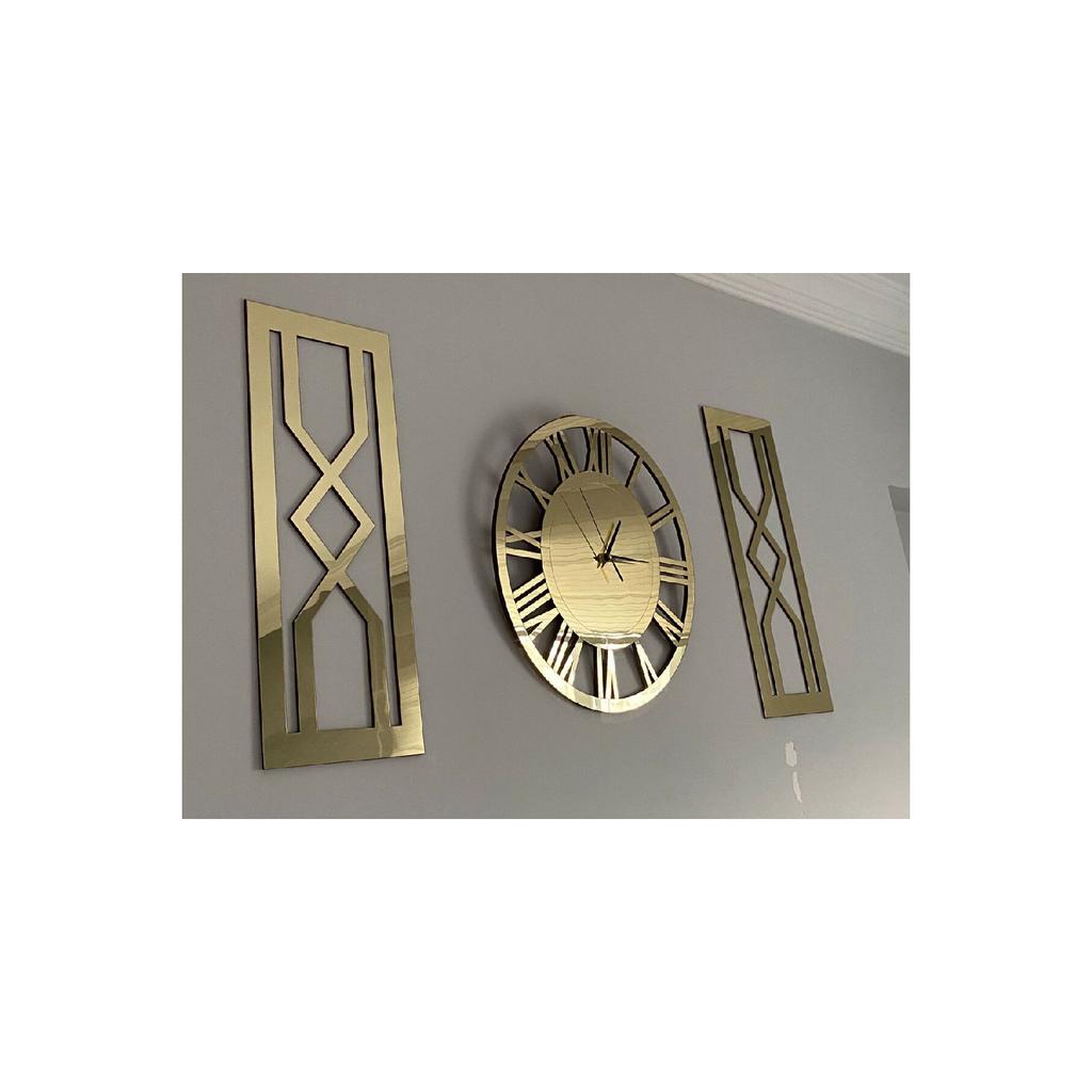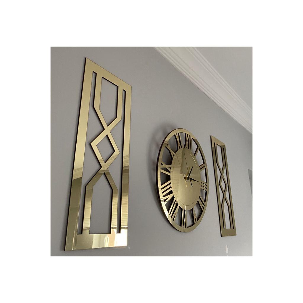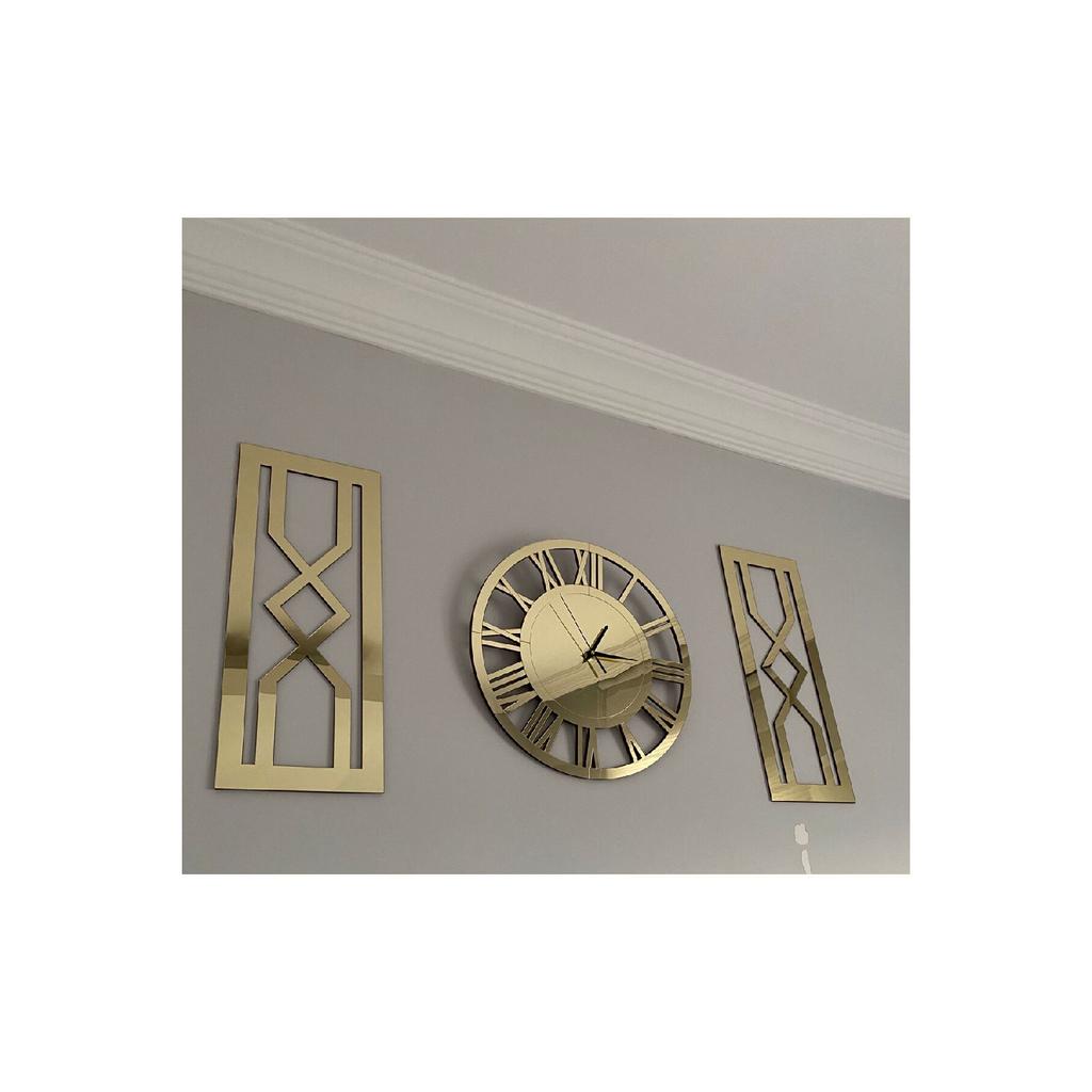 Вы можете легко повесить его на стену благодаря отверстию для подвешивания на задней стороне механизма.. Картины «песочные часы», общая толщина которых достигает 7 мм, были усилены против ударов путем наклеивания золотого зеркального плексигласа на 2 куска МДФ в форме песочных часов размером 25 х 62 см толщиной 6 мм.. Сзади имеются двусторонние ленты, позволяющие надежно и легко закрепить их на стене.. Сняв бумагу на двусторонний скотч, вы легко сможете приклеить картины с песочными часами на стену по своему усмотрению.. Общая площадь, занимаемая декоративными римскими золотыми часами и двумя картинами с золотыми песочными часами на вашей стене, варьируется в зависимости от того, сколько места вы оставляете между ними, но если вы повесите их, не оставляя места, размер составит 100x62 см.. Посетите нашу страницу магазина Tuba Design, чтобы узнать о других моделях часов и размерах.