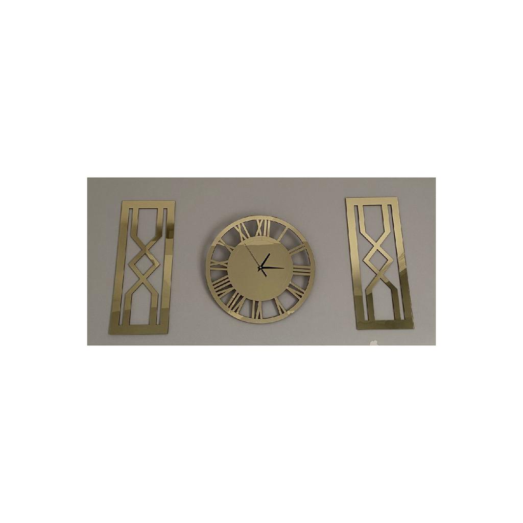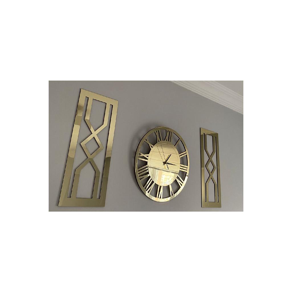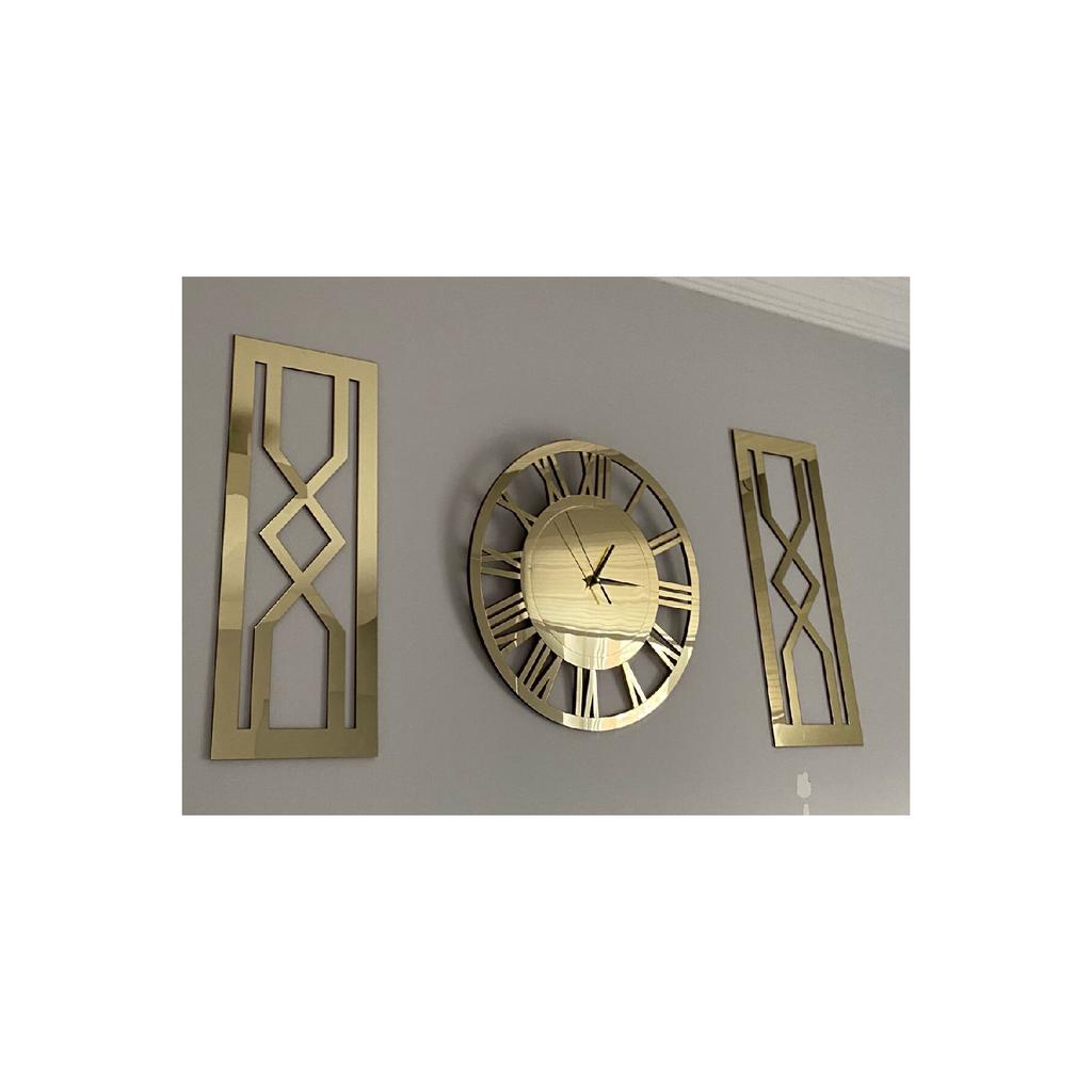 Вы можете легко повесить его на стену благодаря отверстию для подвешивания на задней стороне механизма.. Картины «песочные часы», общая толщина которых достигает 7 мм, были усилены против ударов путем наклеивания золотого зеркального плексигласа на 2 куска МДФ в форме песочных часов размером 25 х 62 см толщиной 6 мм.. Сзади имеются двусторонние ленты, позволяющие надежно и легко закрепить их на стене.. Сняв бумагу на двусторонний скотч, вы легко сможете приклеить картины с песочными часами на стену по своему усмотрению.. Общая площадь, занимаемая декоративными римскими золотыми часами и двумя картинами с золотыми песочными часами на вашей стене, варьируется в зависимости от того, сколько места вы оставляете между ними, но если вы повесите их, не оставляя места, размер составит 100x62 см.. Посетите нашу страницу магазина Tuba Design, чтобы узнать о других моделях часов и размерах.