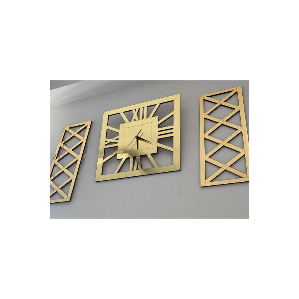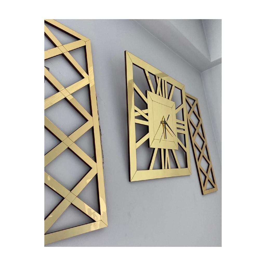 Вы можете легко повесить его на стену благодаря отверстию для подвешивания на задней стороне механизма.. Поперечные столы общей толщиной 10 мм были усилены от ударов путем наклеивания золотого зеркального оргстекла на два куска крестообразного МДФ размером 30 х 70 см и толщиной 9 мм.. Сзади имеются двусторонние ленты, позволяющие надежно и легко закрепить их на стене.. Сняв бумагу на двусторонний скотч, вы легко сможете приклеить к стене ваши кросс-таблицы по вашему желанию.. Общая площадь, занимаемая декоративными квадратными римскими золотыми часами и двумя золотыми крестами на стене, варьируется в зависимости от того, сколько места вы оставляете между ними, но если вы повесите их, не оставляя места, их размер составит 120х70 см.. Посетите нашу страницу магазина Tuba Design, чтобы узнать о других моделях часов и размерах.