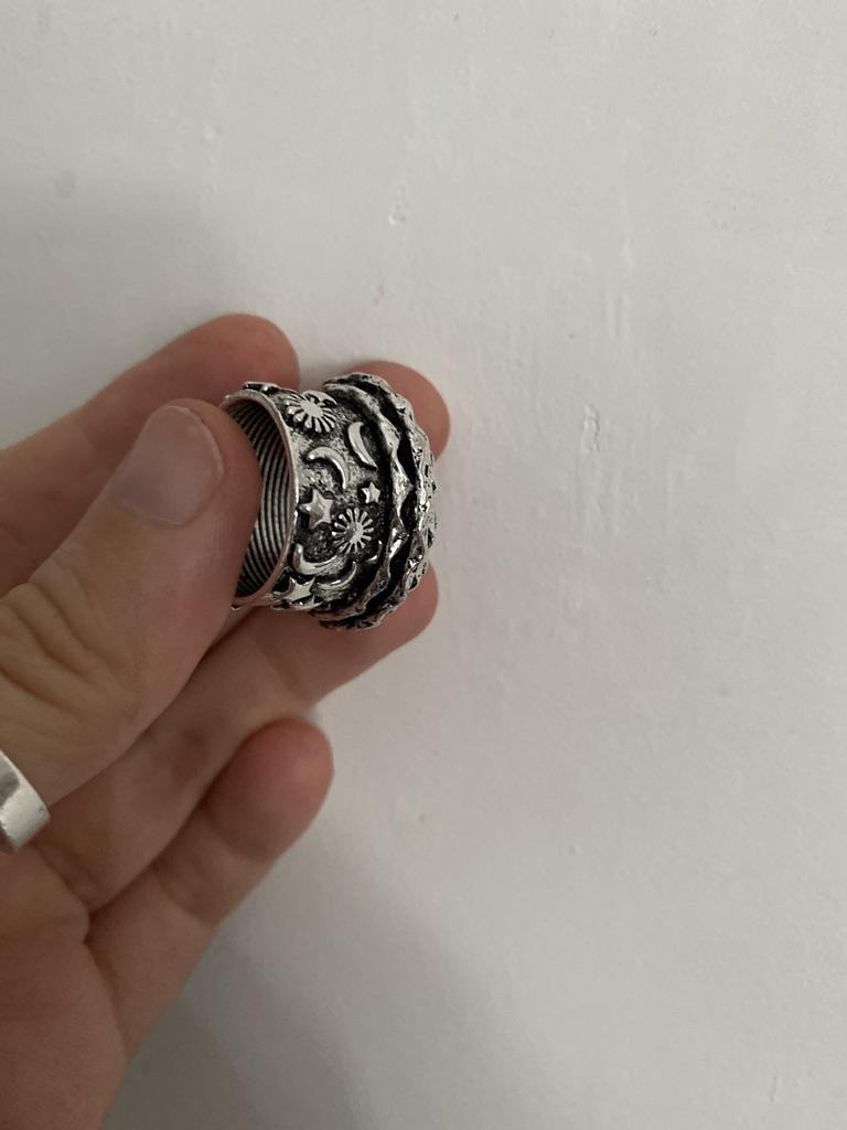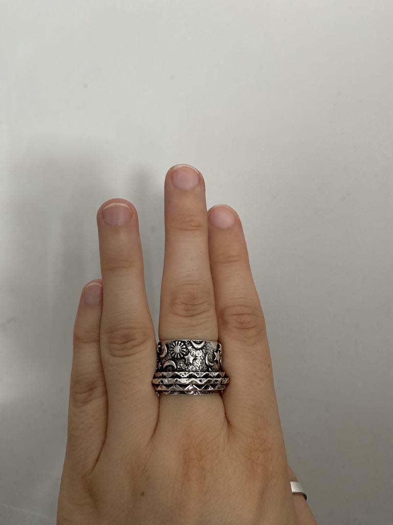 Кольцо тяжелое,добротное,но тонкие кольца очень выпирают и от этого невозможно пальцы вместе держать. При сгибании пальцев все время рефленная часть тоненьких натирает соседние.Некомфортно. На Фотографиях продавца они более распределены по колечку.