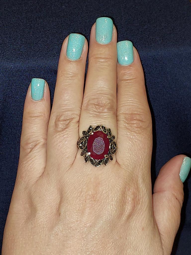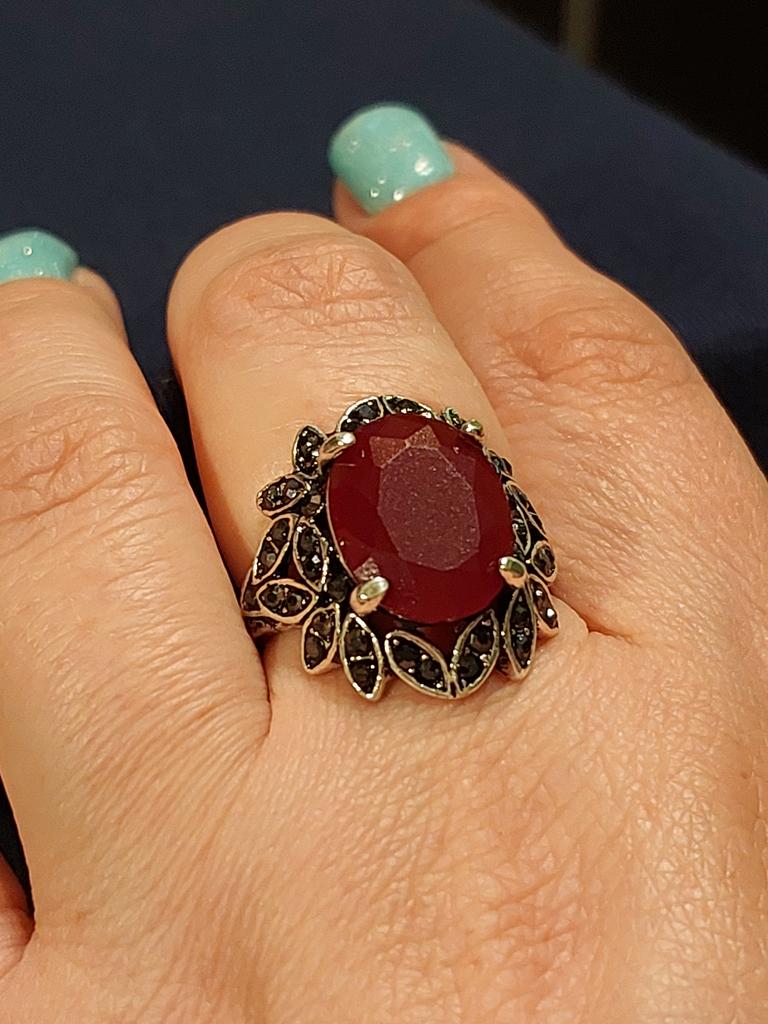 Очень красивое кольцо! Вставка, похоже, стекло, а не пластик, и это очень хорошо. К покупке рекомендую. Размер 10 плотно подошёл на наш 20 размер. До Москвы посылка шла около месяца.