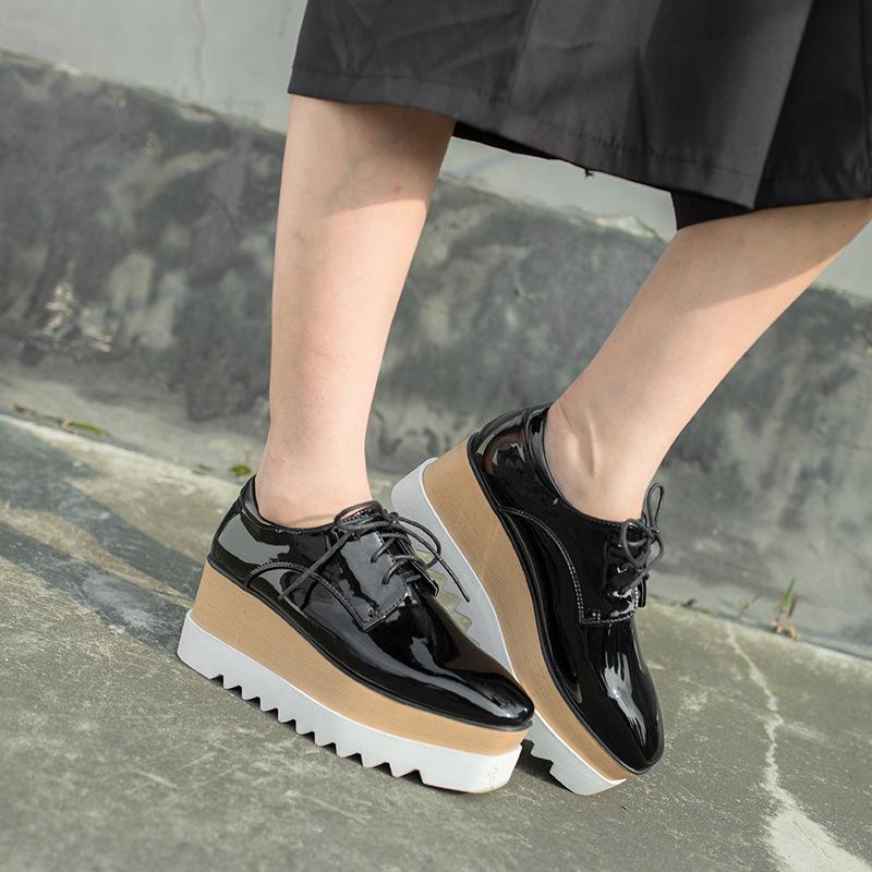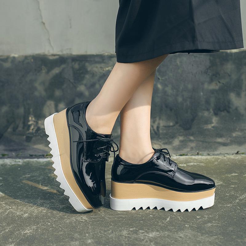 Осенние женские туфли из бисквита в британском стиле на толстой подошве, туфли из лакированной кожи со шнуровкой и квадратным носком, одинарные туфли с глубоким вырезом, высокие каблуки, скошенный каблук HZB