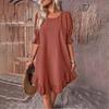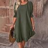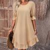 Повседневное среднее свободное хлопково-льняное платье с круглым вырезом на шнуровке