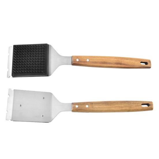 Представляем нашу щетку для барбекю премиум-класса, идеальный инструмент для поддержания чистоты гриля и готовности к следующему приключению с барбекю.. Головка щетки, изготовленная из жаростойких материалов, выдерживает нагрев гриля, не плавясь, что обеспечивает долговечность и долговечность.. Усиленная деревянная ручка повышает прочность и устойчивость, облегчает маневрирование и обеспечивает удобный захват во время использования.