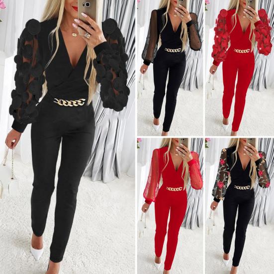 Женский комбинезон с аппликацией в виде розы, прозрачная сетка, декор в виде цепочки, приталенный, с V-образным вырезом, с высокой талией, однотонный — купить товар онлайн с бесплатной доставкой по всему миру!