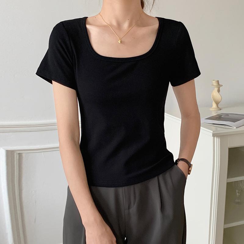 Высококачественная хлопковая высокоэластичная футболка с квадратным вырезом, женская футболка с короткими рукавами, новая летняя облегающая рубашка 2024 года, лето 2024