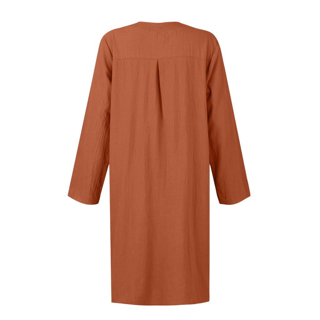 Женское большое свободное однотонное хлопковое льняное платье с круглым вырезом и короткими рукавами с карманами и пуговицами